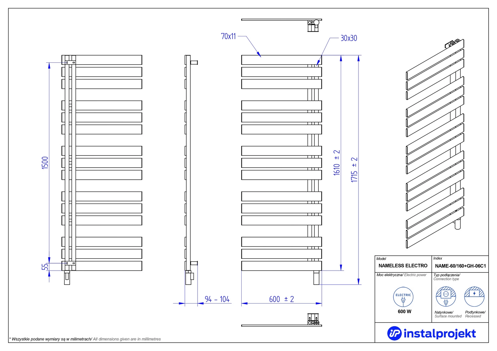 - Instal Projekt Nameless Electro Grzejnik elektryczny 60x160 cm czarna struktura/black structure NAME-60/160C33+GH-06C2