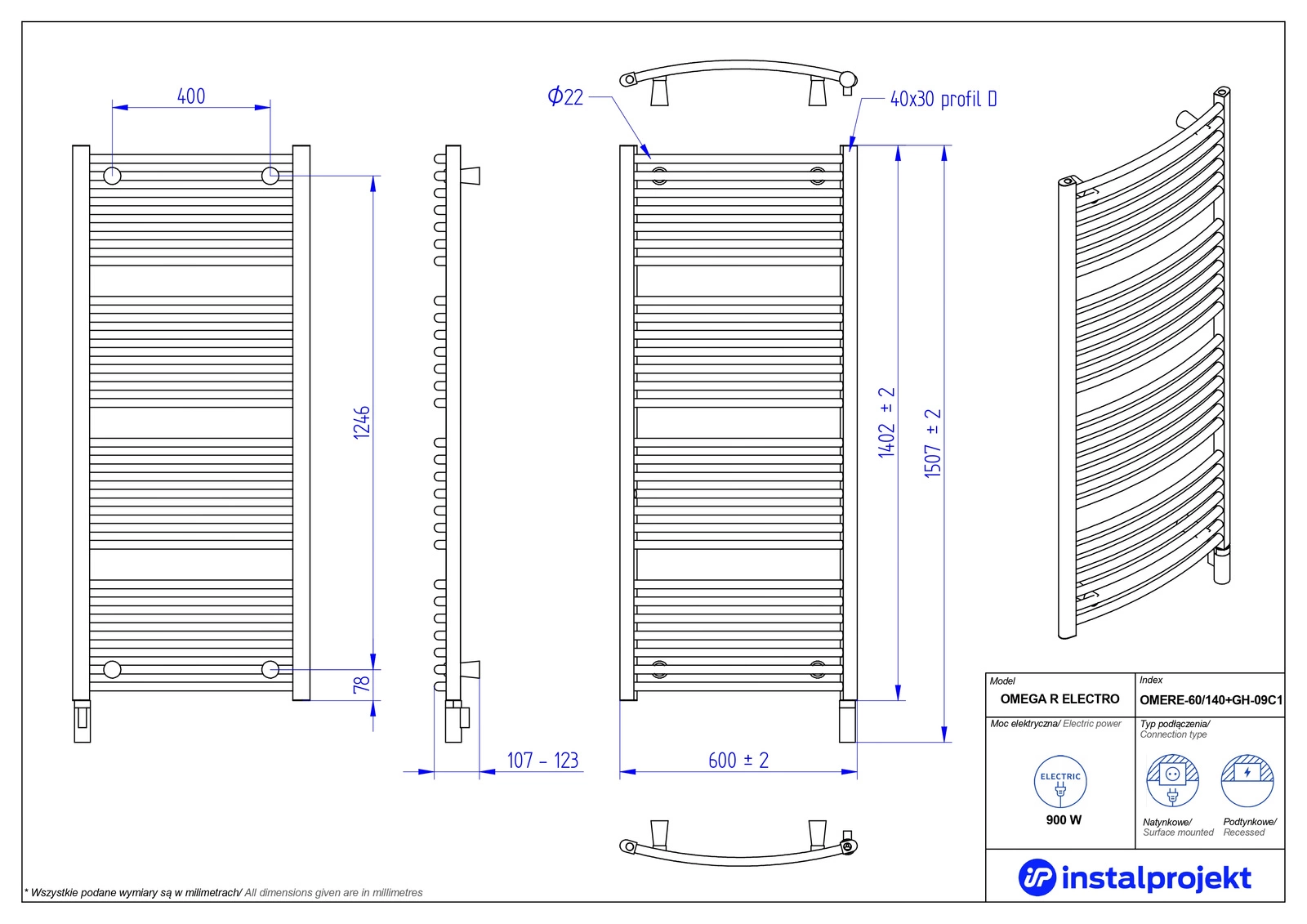 Instal Projekt Omer Electro Grzejnik elektryczny 60x140 cm biały połysk/white silk OMERE-60/140+GH-09C1
