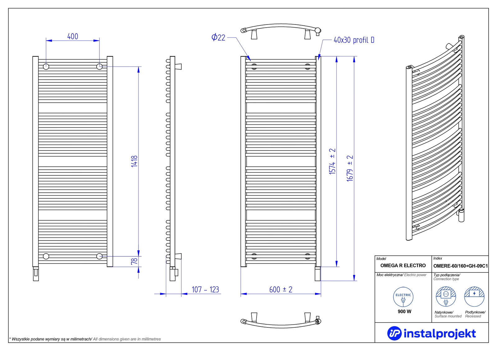 • Instal Projekt Omer Electro Grzejnik elektryczny 60x160 cm biały połysk/white silk OMERE-60/160+GH-09C1