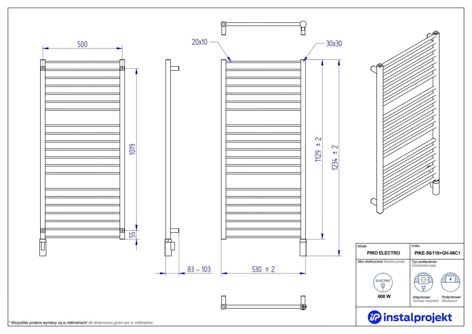 Grzejnik łazienkowy PIKO ELECTRO to wyjątkowy produkt! Spełnia oczekiwania zarówno poszukiwaczy typowo użytkowych korzyści, jak i osób zwracających dużą uwagę na wygląd urządzenia. Łączy w sobie bowiem niezawodne działanie i sprawdzoną konstrukcję odporną na uszkodzenia, a także nowoczesny design z wysoką precyzją wykończenia. Poprzez geometryczne akcenty dodaje charakteru nawet najprostszej aranżacji. Jednocześnie może zostać łatwo dopasowany do każdego wnętrza, dając efekt zachwycającej spójności z otoczeniem. W PIKO ELECTRO – tak, jak w innych grzejnikach – każdy element tworzymy z najwyższą starannością. To uwidacznia się w solidności całego produktu, również najmniejszych detali. Dzięki temu grzejnik przyciąga spojrzenia i zapada w pamięć. Dostępny jest w 23 kolorach z palety IP. Za dodatkową opłatą możemy przemalować go na dowolny kolor z palety RAL.MOŻLIWOŚĆ ZAMÓWIENIA WERSJI PODTYNKOWEJ