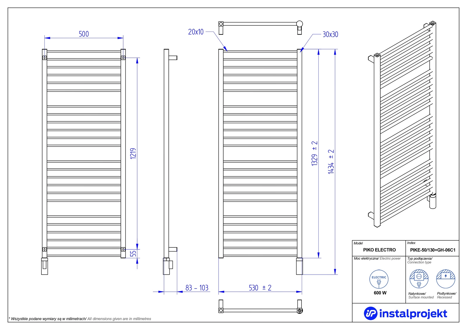 Grzejnik łazienkowy PIKO ELECTRO to wyjątkowy produkt! Spełnia oczekiwania zarówno poszukiwaczy typowo użytkowych korzyści, jak i osób zwracających dużą uwagę na wygląd urządzenia. Łączy w sobie bowiem niezawodne działanie i sprawdzoną konstrukcję odporną na uszkodzenia, a także nowoczesny design z wysoką precyzją wykończenia. Poprzez geometryczne akcenty dodaje charakteru nawet najprostszej aranżacji. Jednocześnie może zostać łatwo dopasowany do każdego wnętrza, dając efekt zachwycającej spójności z otoczeniem. W PIKO ELECTRO – tak, jak w innych grzejnikach – każdy element tworzymy z najwyższą starannością. To uwidacznia się w solidności całego produktu, również najmniejszych detali. Dzięki temu grzejnik przyciąga spojrzenia i zapada w pamięć. Dostępny jest w 23 kolorach z palety IP. Za dodatkową opłatą możemy przemalować go na dowolny kolor z palety RAL.MOŻLIWOŚĆ ZAMÓWIENIA WERSJI PODTYNKOWEJ