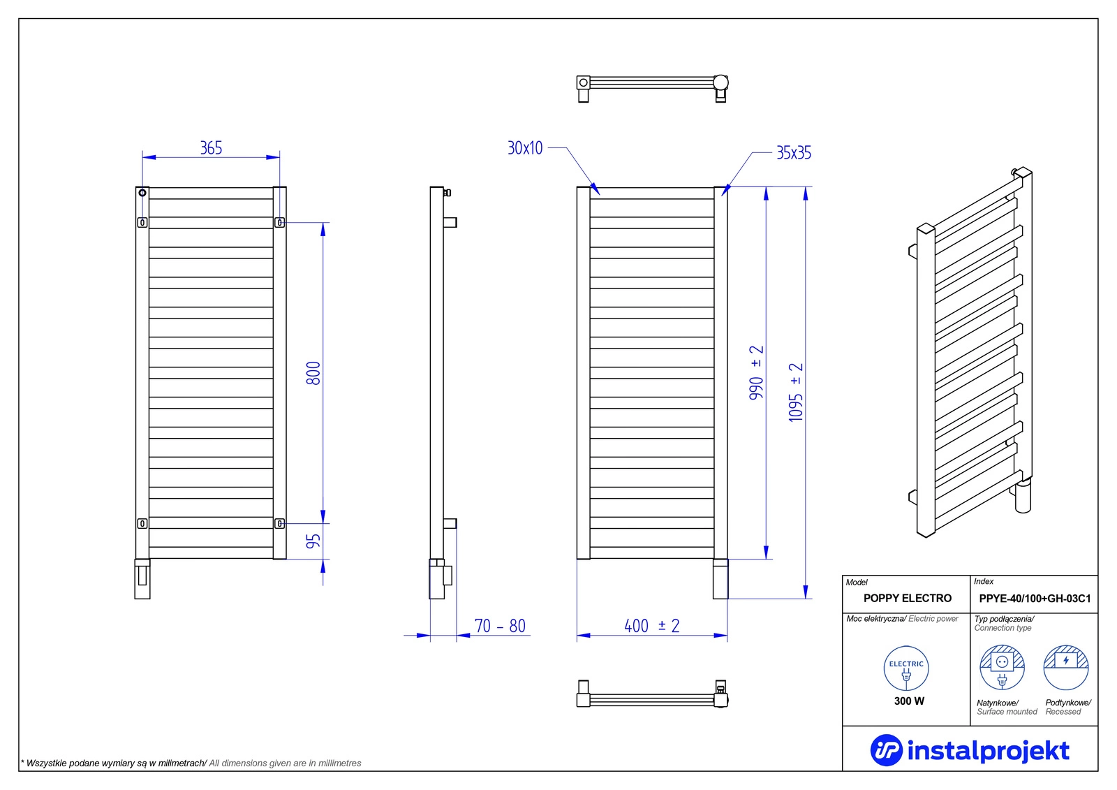 Grzejnik elektryczny POPPY ELECTRO to nowoczesne wydanie dobrze znanej drabinki. Oryginalności dodaje mu dwurzędowość poziomych, wąskich profili o prostokątnym przekroju. Wprowadza do wnętrz niezwykle modny, geometryczny akcent. Kształtowniki dodają przestronności, a zamknięta forma odpowiada za poczucie harmonii i spokoju. Grzejnik dostępny w czarnym i białym kolorze, w wersji matowej, z połyskiem i widoczną strukturą materiału ale również we wszystkich 23 kolorach z palety IP. Możliwe podłączenie podtynkowe, dzięki któremu urządzenie niejako staje się integralną częścią, bez wystających przewodów, tworząc piękny efekt spójności.