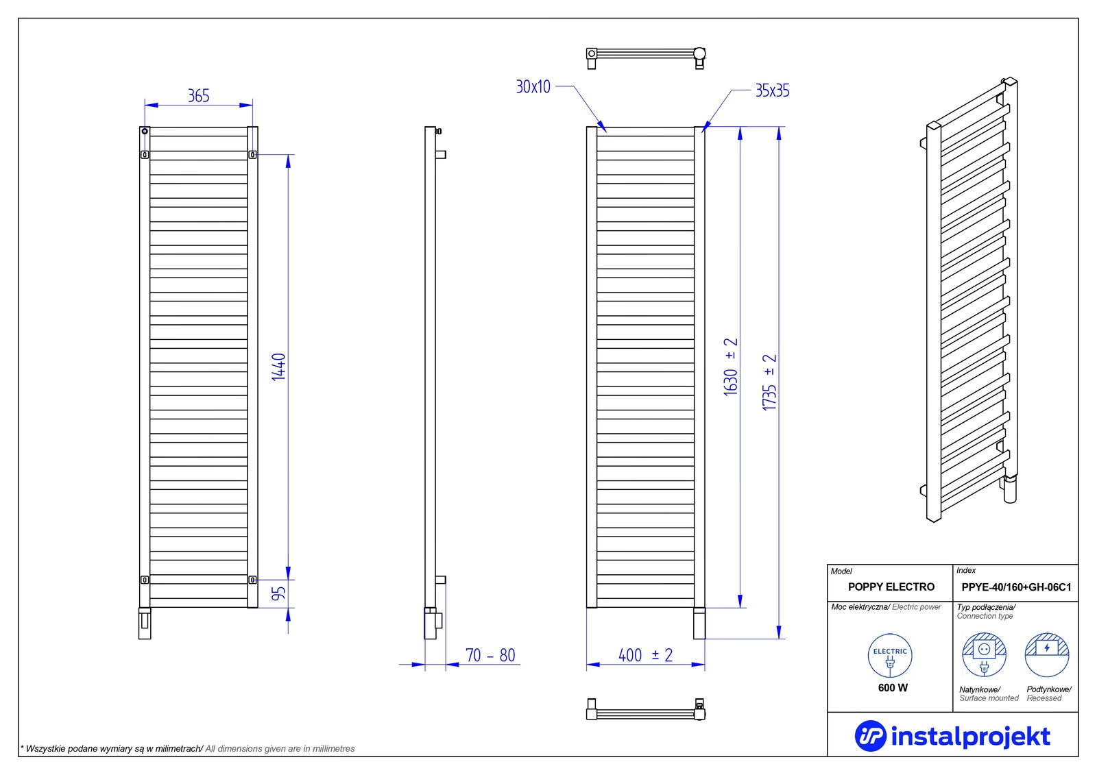 Grzejnik elektryczny POPPY ELECTRO to nowoczesne wydanie dobrze znanej drabinki. Oryginalności dodaje mu dwurzędowość poziomych, wąskich profili o prostokątnym przekroju. Wprowadza do wnętrz niezwykle modny, geometryczny akcent. Kształtowniki dodają przestronności, a zamknięta forma odpowiada za poczucie harmonii i spokoju. Grzejnik dostępny w czarnym i białym kolorze, w wersji matowej, z połyskiem i widoczną strukturą materiału ale również we wszystkich 23 kolorach z palety IP. Możliwe podłączenie podtynkowe, dzięki któremu urządzenie niejako staje się integralną częścią, bez wystających przewodów, tworząc piękny efekt spójności.