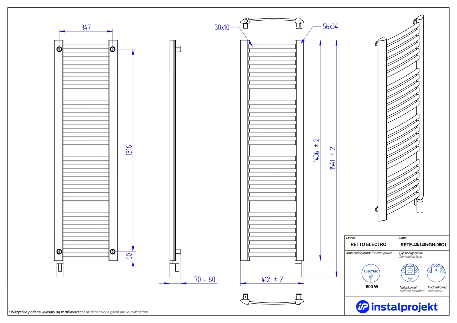 Grzejnik łazienkowy RETTO ELECTRO działa w oparciu o grzałkę elektryczną. Dzięki temu pracuje zawsze, gdy tego potrzebujesz – po podłączeniu do prądu. Za sprawą opatentowanej technologii grzewczej zużywa niewielką ilość energii wobec ciepła, które generuje. Stanowi świetne rozwiązanie zwłaszcza dla mieszkań bez instalacji c.o., z ogrzewaniem podłogowym i sufitowym, ale bez miejsca na suszenie tekstyliów. Montaż nie sprawia problemów; można przeprowadzić go samodzielnie, a w razie przeprowadzki lub remontu przenieść grzejnik w nowe miejsce.MOŻLIWOŚĆ ZAMÓWIENIA WERSJI PODTYNKOWEJ