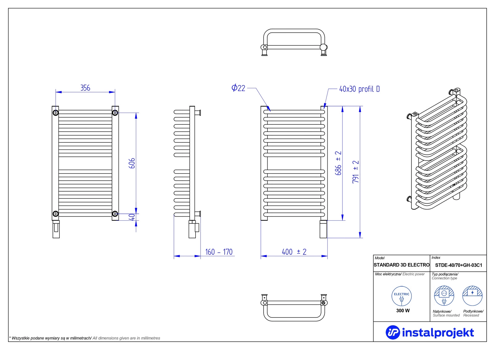Instal Projekt Standard 3D Electro Grzejnik elektryczny 40x70 cm biały połysk/white silk STDE-40/70+GH-03C1