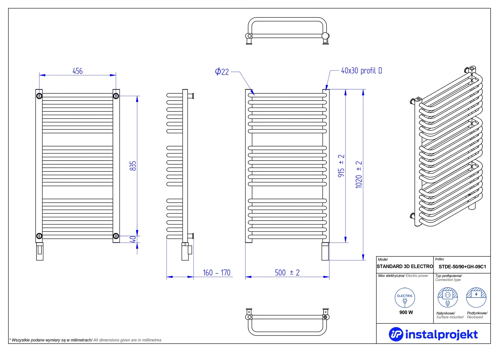 - Instal Projekt Standard 3D Electro Grzejnik elektryczny 50x90 cm biały połysk/white silk STDE-50/90+GH-09C1