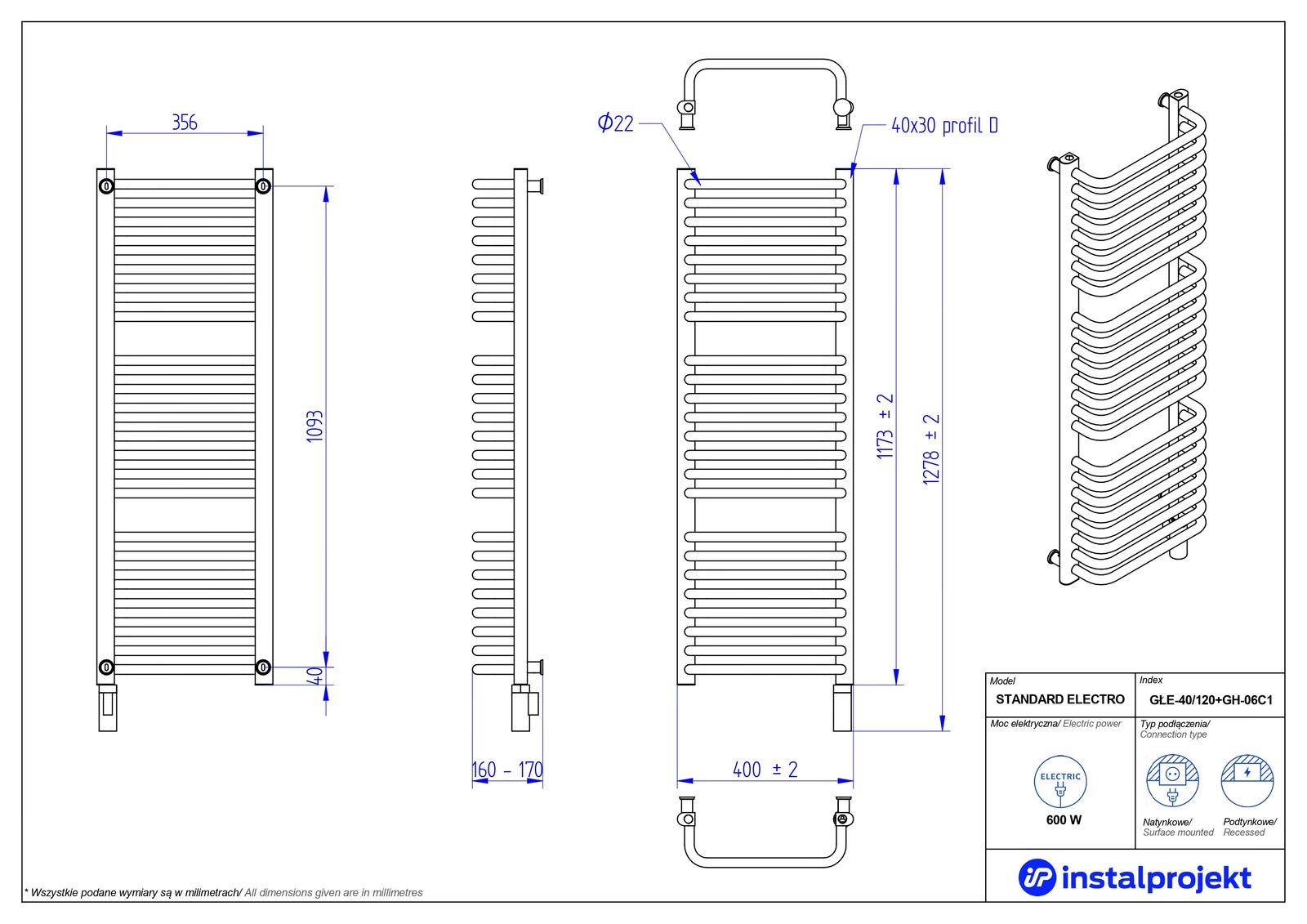• Instal Projekt Standard Electro Grzejnik elektryczny 40x120 cm biały połysk/white silk GŁE-40/120+GH-06C1