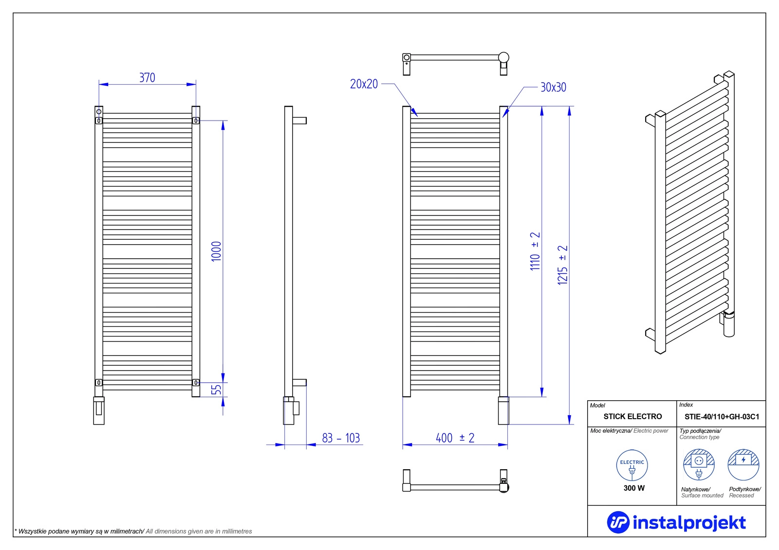 - Instal Projekt Stick Electro Grzejnik elektryczny 40x110 cm czarny/black swan STIE-40/110C75+GH-03C2
