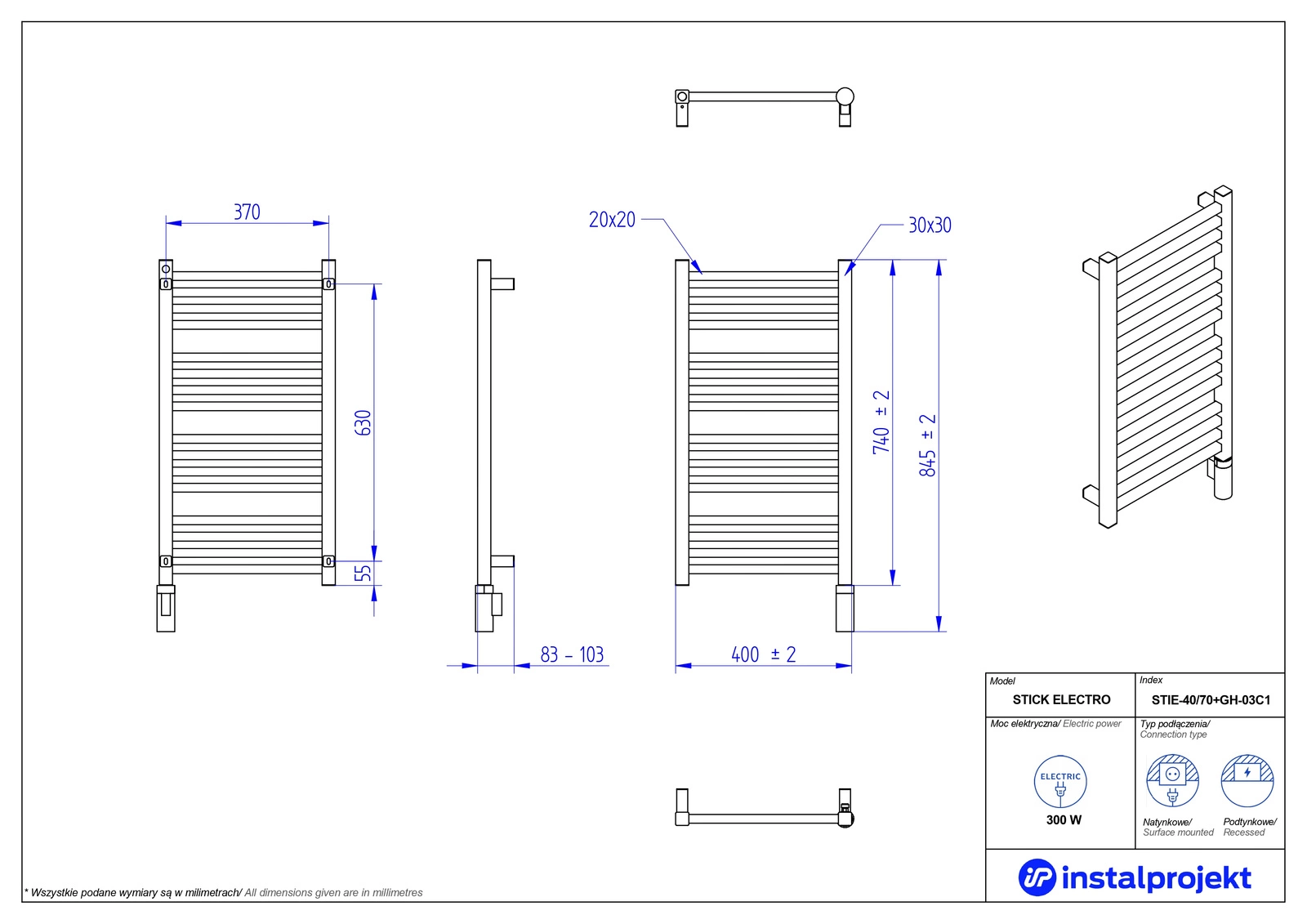 - Instal Projekt Stick Electro Grzejnik elektryczny 40x70 cm biały połysk/white silk STIE-40/70+GH-03C1