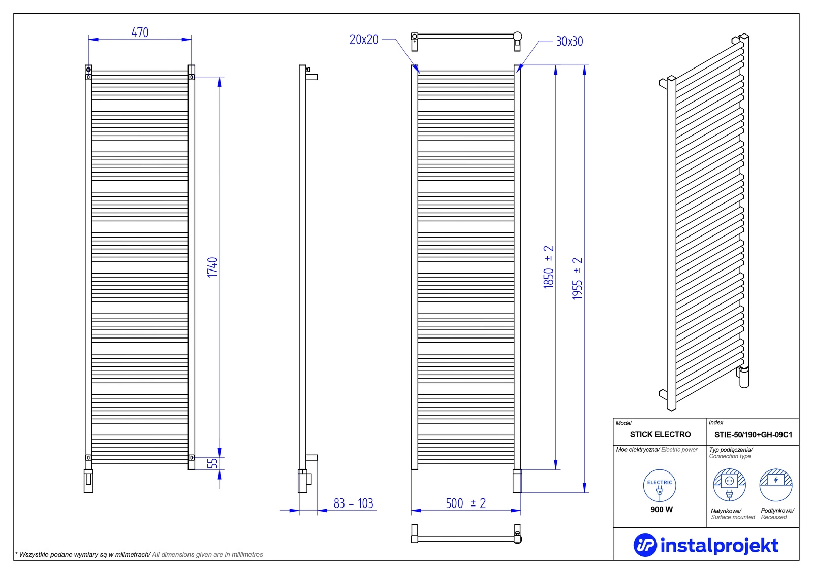 - Instal Projekt Stick Electro Grzejnik elektryczny 50x190 cm czarny/black swan STIE-50/190C75+GH-09C2