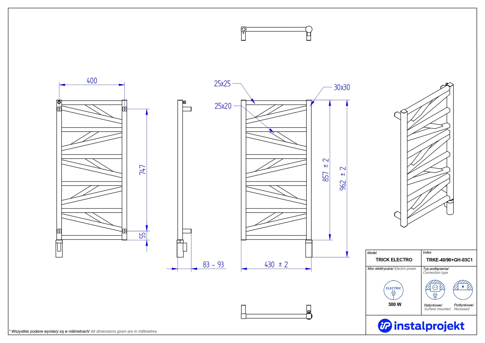 TRICK ELECTRO oferuje nie tylko oryginalny design, ale też dużą wygodę. Wynika ona z obecności poziomych profili, na których rozwiesisz niewielkie tekstylia, by je dosuszyć i oczywiście dużej wydajności grzewczej. Dzięki opatentowanej technologii urządzenie pobiera stosunkowo niewiele energii wobec ciepła, jakie generuje, uprzytulniając nawet dużą i chłodną łazienkę. Wykorzystano w nim najnowszy model grzałki elektrycznej: HOT2. Za jej sprawą grzejnik zyskał kilkustopniowe sterowanie dotykowe, timer, sygnalizację stanów alarmowych, a nawet tryb przeciwdziałający zamarzaniu. To oznacza łatwą obsługę dla wszystkich domowników. Urządzenie może zostać zamontowane na dwa sposoby: natynkowo lub podtynkowo.MOŻLIWOŚĆ ZAMÓWIENIA WERSJI PODTYNKOWEJ
