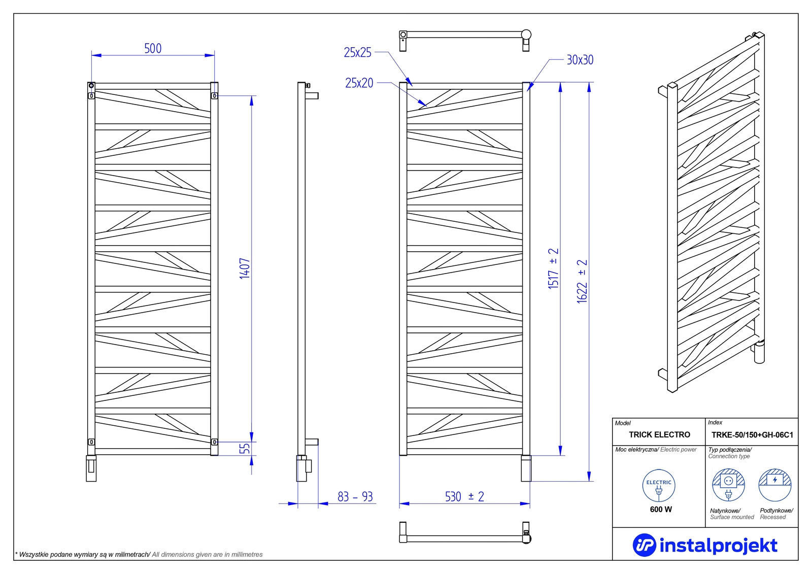 TRICK ELECTRO oferuje nie tylko oryginalny design, ale też dużą wygodę. Wynika ona z obecności poziomych profili, na których rozwiesisz niewielkie tekstylia, by je dosuszyć i oczywiście dużej wydajności grzewczej. Dzięki opatentowanej technologii urządzenie pobiera stosunkowo niewiele energii wobec ciepła, jakie generuje, uprzytulniając nawet dużą i chłodną łazienkę. Wykorzystano w nim najnowszy model grzałki elektrycznej: HOT2. Za jej sprawą grzejnik zyskał kilkustopniowe sterowanie dotykowe, timer, sygnalizację stanów alarmowych, a nawet tryb przeciwdziałający zamarzaniu. To oznacza łatwą obsługę dla wszystkich domowników. Urządzenie może zostać zamontowane na dwa sposoby: natynkowo lub podtynkowo.MOŻLIWOŚĆ ZAMÓWIENIA WERSJI PODTYNKOWEJ