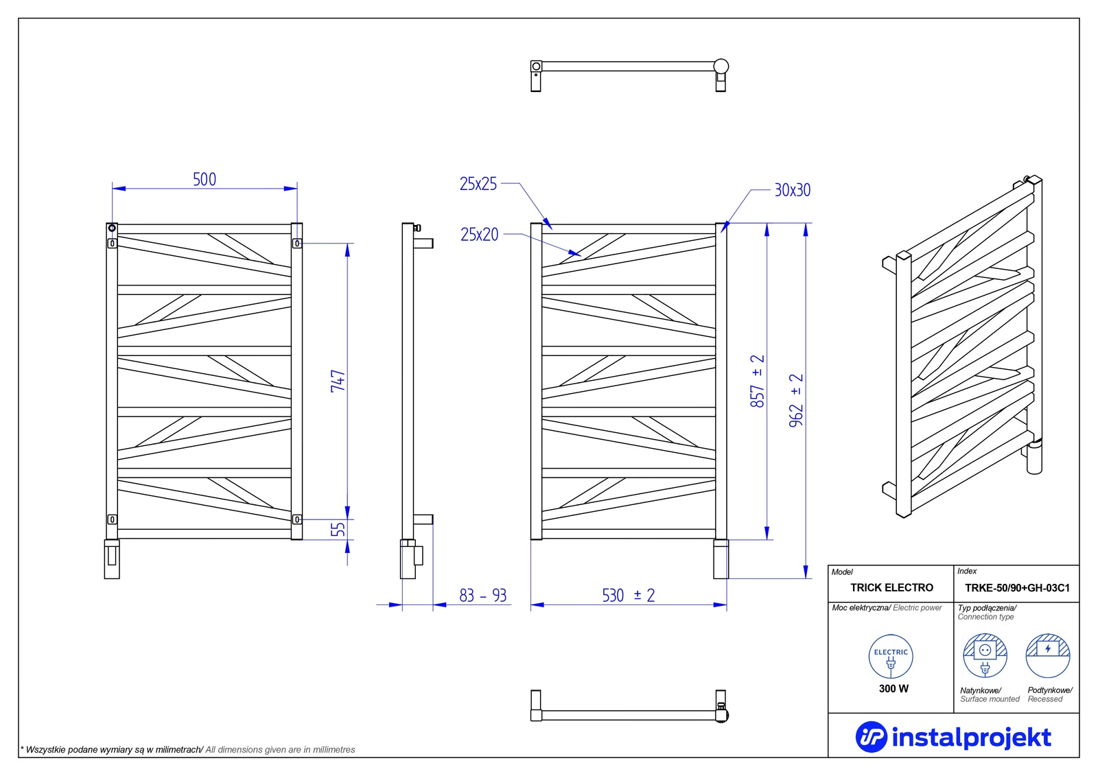 TRICK ELECTRO oferuje nie tylko oryginalny design, ale też dużą wygodę. Wynika ona z obecności poziomych profili, na których rozwiesisz niewielkie tekstylia, by je dosuszyć i oczywiście dużej wydajności grzewczej. Dzięki opatentowanej technologii urządzenie pobiera stosunkowo niewiele energii wobec ciepła, jakie generuje, uprzytulniając nawet dużą i chłodną łazienkę. Wykorzystano w nim najnowszy model grzałki elektrycznej: HOT2. Za jej sprawą grzejnik zyskał kilkustopniowe sterowanie dotykowe, timer, sygnalizację stanów alarmowych, a nawet tryb przeciwdziałający zamarzaniu. To oznacza łatwą obsługę dla wszystkich domowników. Urządzenie może zostać zamontowane na dwa sposoby: natynkowo lub podtynkowo.MOŻLIWOŚĆ ZAMÓWIENIA WERSJI PODTYNKOWEJ