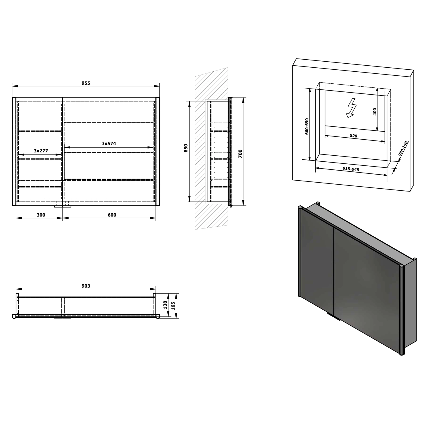 WyposażenieOświetlenie, Dwustronne drzwiczki lustrzane, Zawiasy samohamujące, Do zabudowy