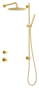 Szczotkowany mosiądz PVD – ciepły, ekspresyjny i elegancko zrównoważony. Ścienne ramię, deszczownica 30 cm i elastyczne rozwiązanie z drążkiem nadają strukturę i ton współczesnym wnętrzom poszukującym dotykowego luksusu.