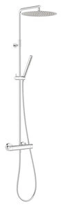 Chrom polerowany z mosiężną deszczownicą 30 cm i słuchawką prysznicową Iris 3-funkcyjną. Klasyczna konfiguracja prysznica termostatycznego z regulowaną wysokością, zintegrowanym przełącznikiem i metalowym wężem antyskrętnym dla niezawodnego codziennego użytku.
