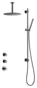 Szary grafit PVD o spokojnej głębi i miękkim, matowym wyrazie. Zintegrowane przyłącze w drążku i słuchawka prysznicowa dopełniają minimalistyczny, sufitowy profil w tonalnej harmonii.