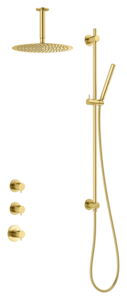 Szczotkowany mosiądz PVD dodaje ciepła do konfiguracji pionowego drążka prysznicowego. Złoty ton konfiguracji sufitowej równoważy strukturę z miękkością – wybór dla łazienek z charakterem i osobowością.