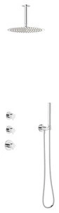 Chrom polerowany z 15 cm ramieniem sufitowym i deszczownicą 30 cm. Wyrazisty, architektoniczny wygląd, który pasuje zarówno do minimalistycznych, jak i klasycznych wnętrz. Zawiera słuchawkę prysznicową 3-funkcyjną, metalowy wąż i elastyczne przyłącze ścienne.