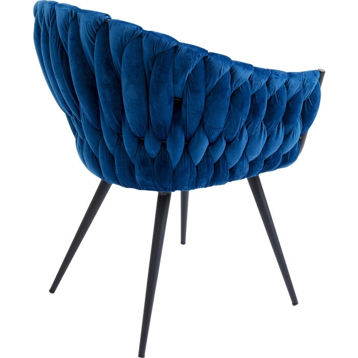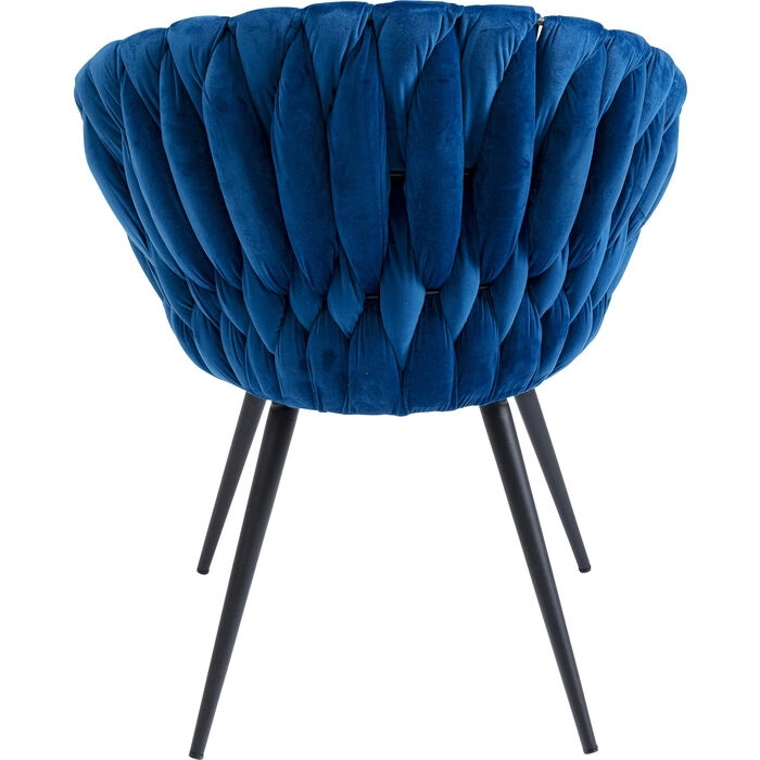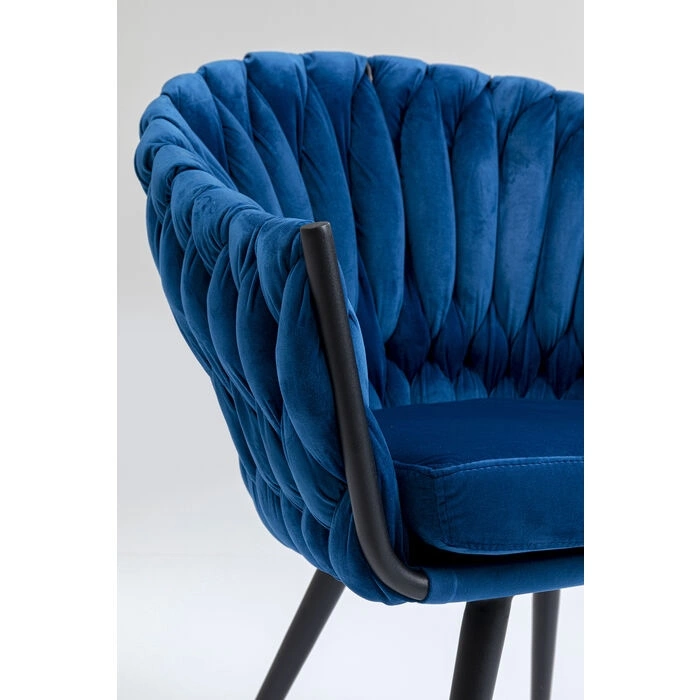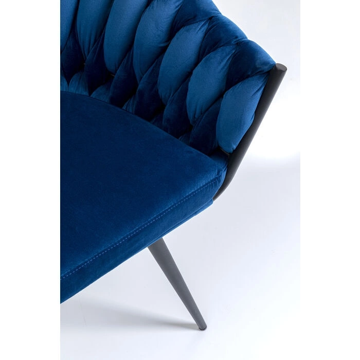KARE krzesło KNOT ciemny niebieski. Nowoczesny, elegancki design, który musisz mieć! Kształtne siedzisko o ozdobnym splocie wykonano z aksamitnej tkaniny welurowej w głębokim niebieskim kolorze. Oryginalnego charakteru dodają czarne akcenty. Smukłe nóżki wykonano zej stali. Dostępne różne kolory. Wymiary: wys. 81 cm / szer. 62 cm / gł. 59 cm Wysokość do krawędzi siedziska: 48 cm Waga: 8,3 kg.