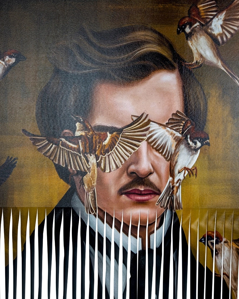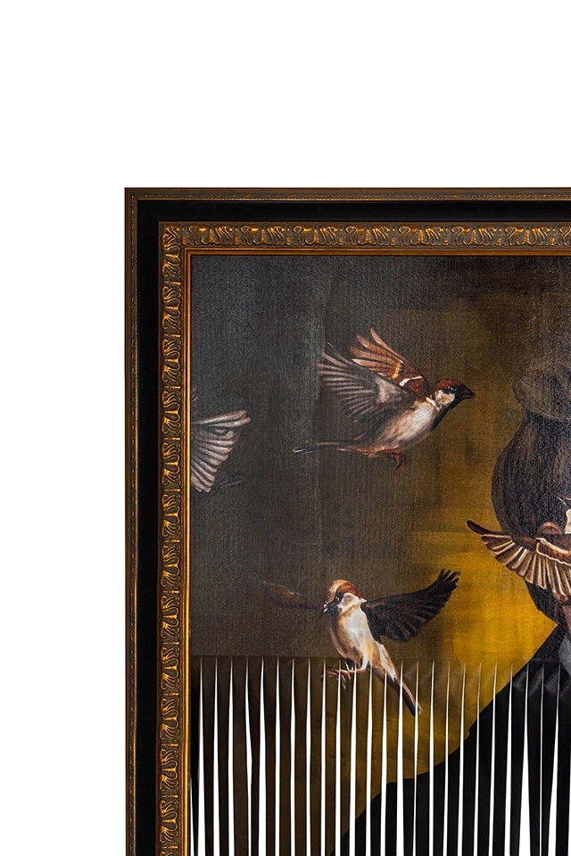 KARE obraz GENTLEMAN CUTS 130x163 cm. Zainspirowany niebywałym wydarzeniem, kiedy to dzieło sztuki od artysty Banksy rozerwało się na strzępy podczas aukcji. Obraz ten ukazuje portret mężczyzny Gentelmena w nowoczesnym, surrealistycznym wydaniu. Jego twarz zasłonięto wznoszącymi się ptakami, a dół płótna kontrowersyjnie pocięto w paski. To doskonały przykład oryginalnej sztuki nowoczesnej, przyciągającej wzrok oraz będącej tematem do wielu rozmów. Obraz wykonano na płótnie w stylu starych obrazów olejnych, a wykończenie ściany farbą subtelnie mieni się między paskami płótna. Dodaj do swojego wnętrza inspirującego dzieła sztuki. Wymiary: wys. 163 cm / szer. 130 cm / gł. 4,5 cm Waga brutto: 8,3 kg.