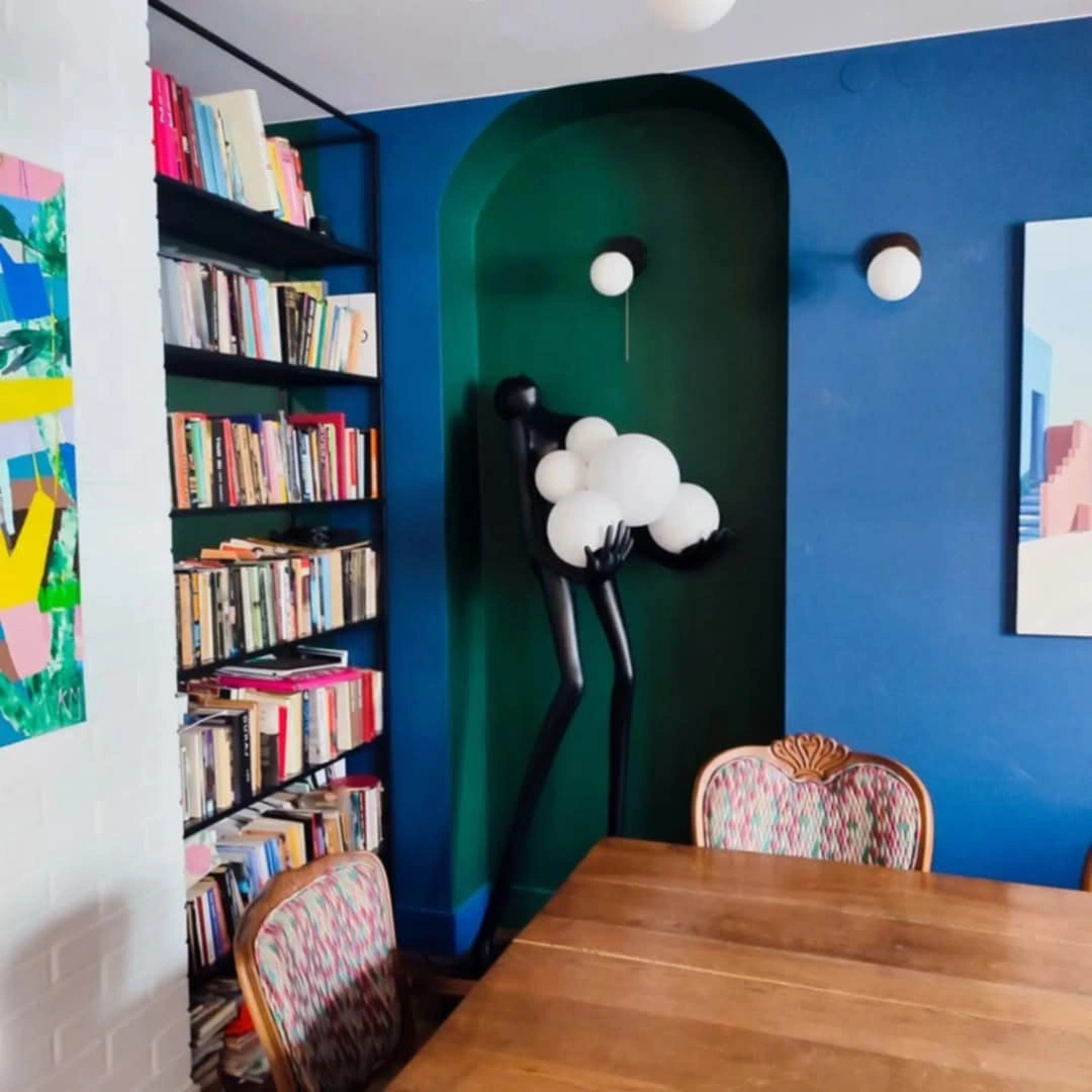 Dynamiczna sylwetka kobiety z wyprostowanymi ramionami stanowi wyrazisty element aranżacji wnętrza.
