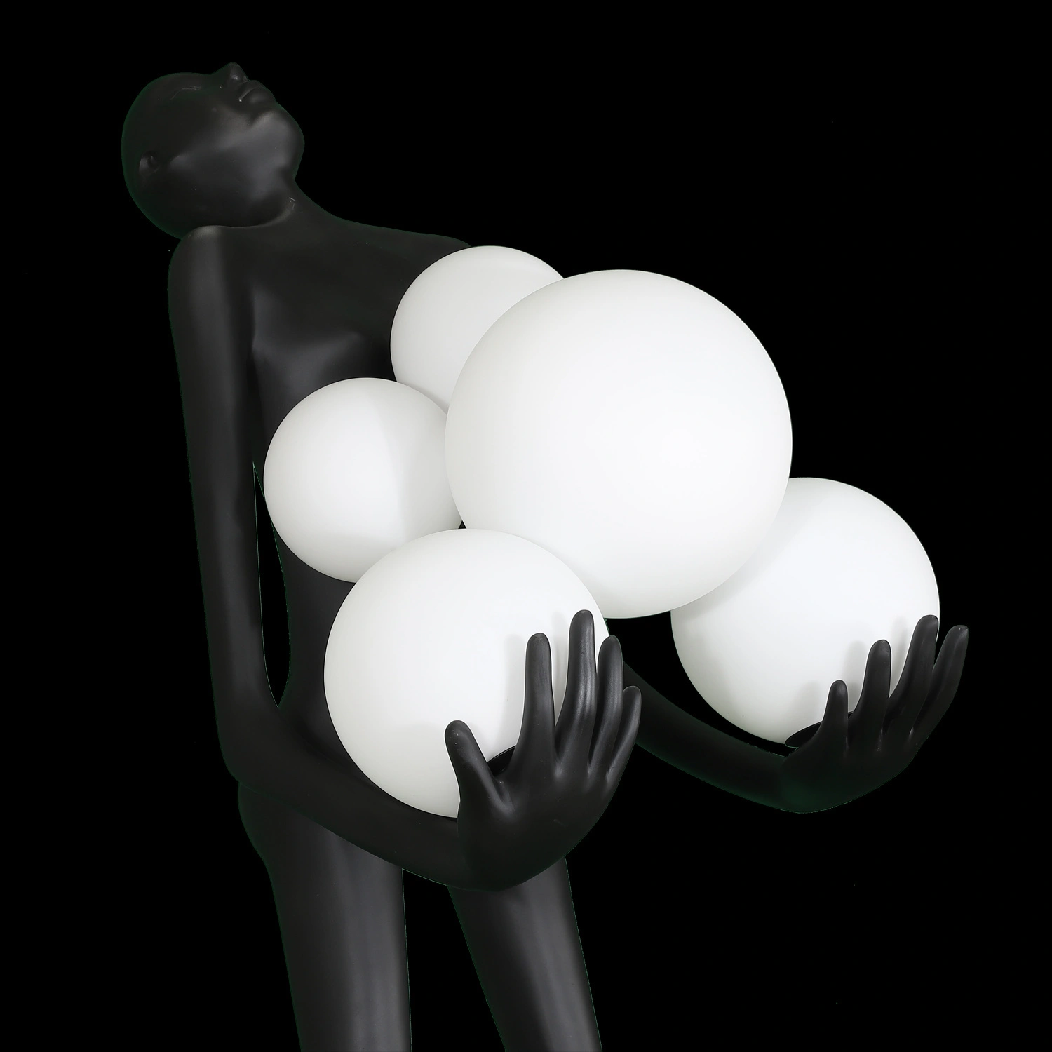 W dłoniach postaci umieszczono sześć szklanych kloszy w mlecznym wykończeniu, odpowiadających za równomierne rozproszenie światła.