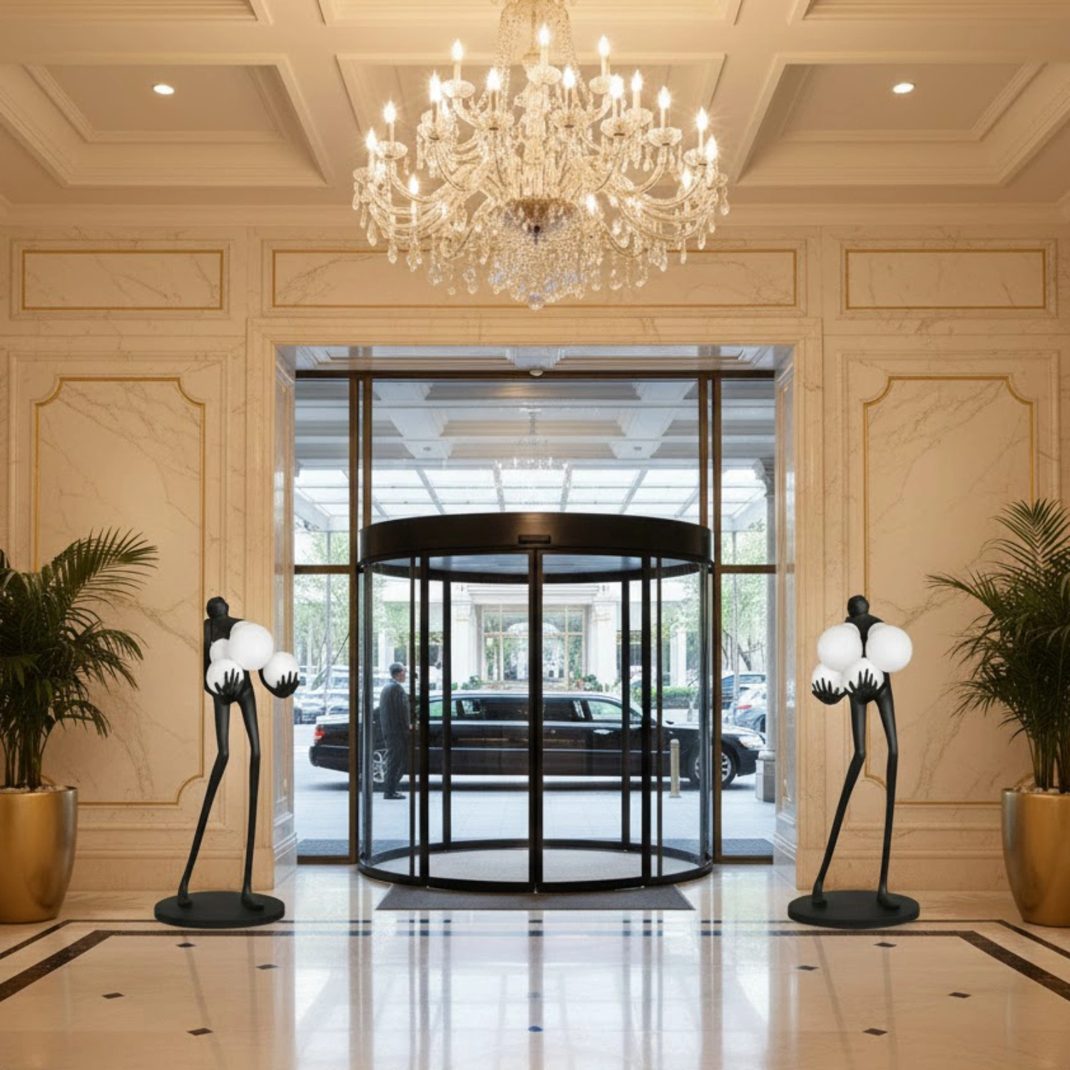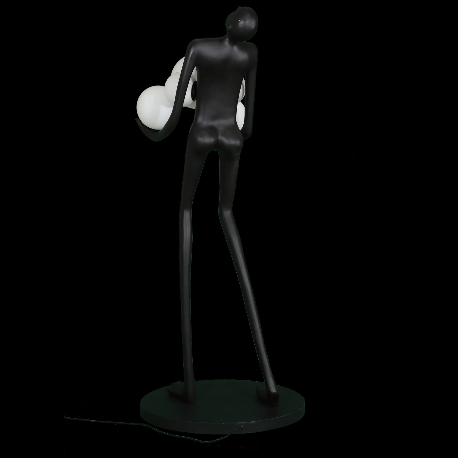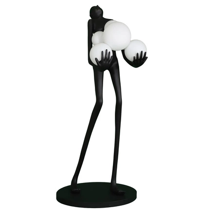 - Rzeźbiarska lampa podłogowa WOMAN wykonana z włókna szklanego. Forma kobiecej sylwetki, 6 kloszy E27. Do wnętrz reprezentacyjnych i hoteli.