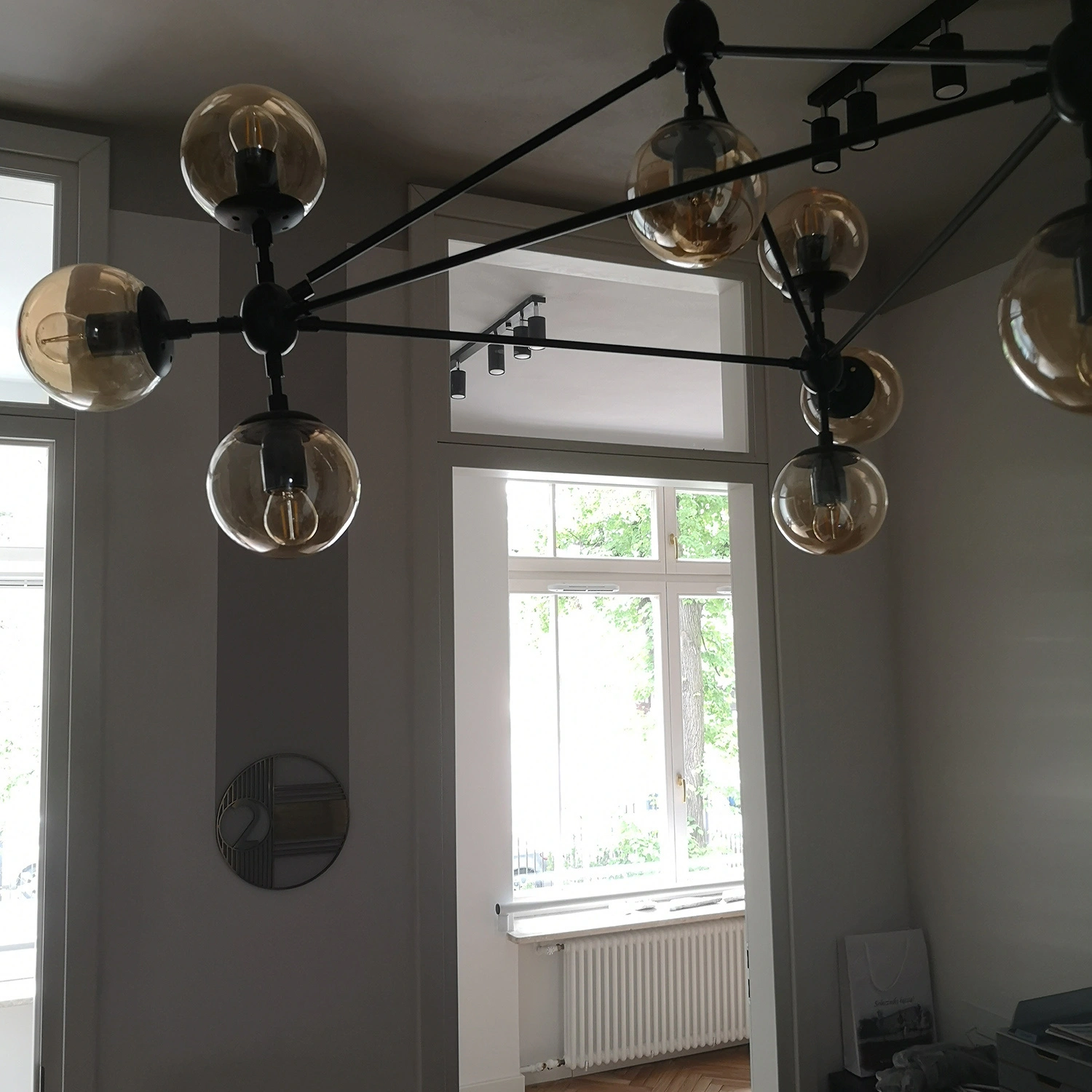 Konstrukcja jest  na planie trójkąta, stelaż w kolorze czarnym matowym z okrągłymi, bursztynowymi kloszami.