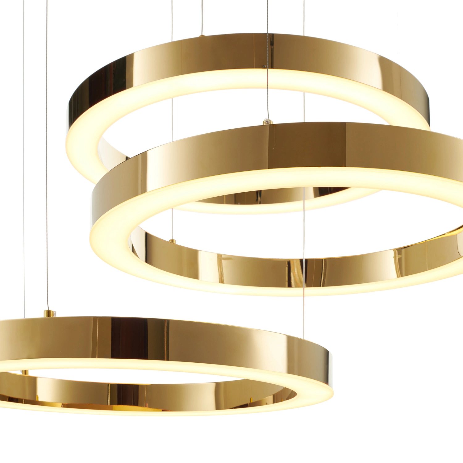 - Trzy duże koła ledowe złączone w jedną lampę wiszącą w kolorze polerowanego złota.