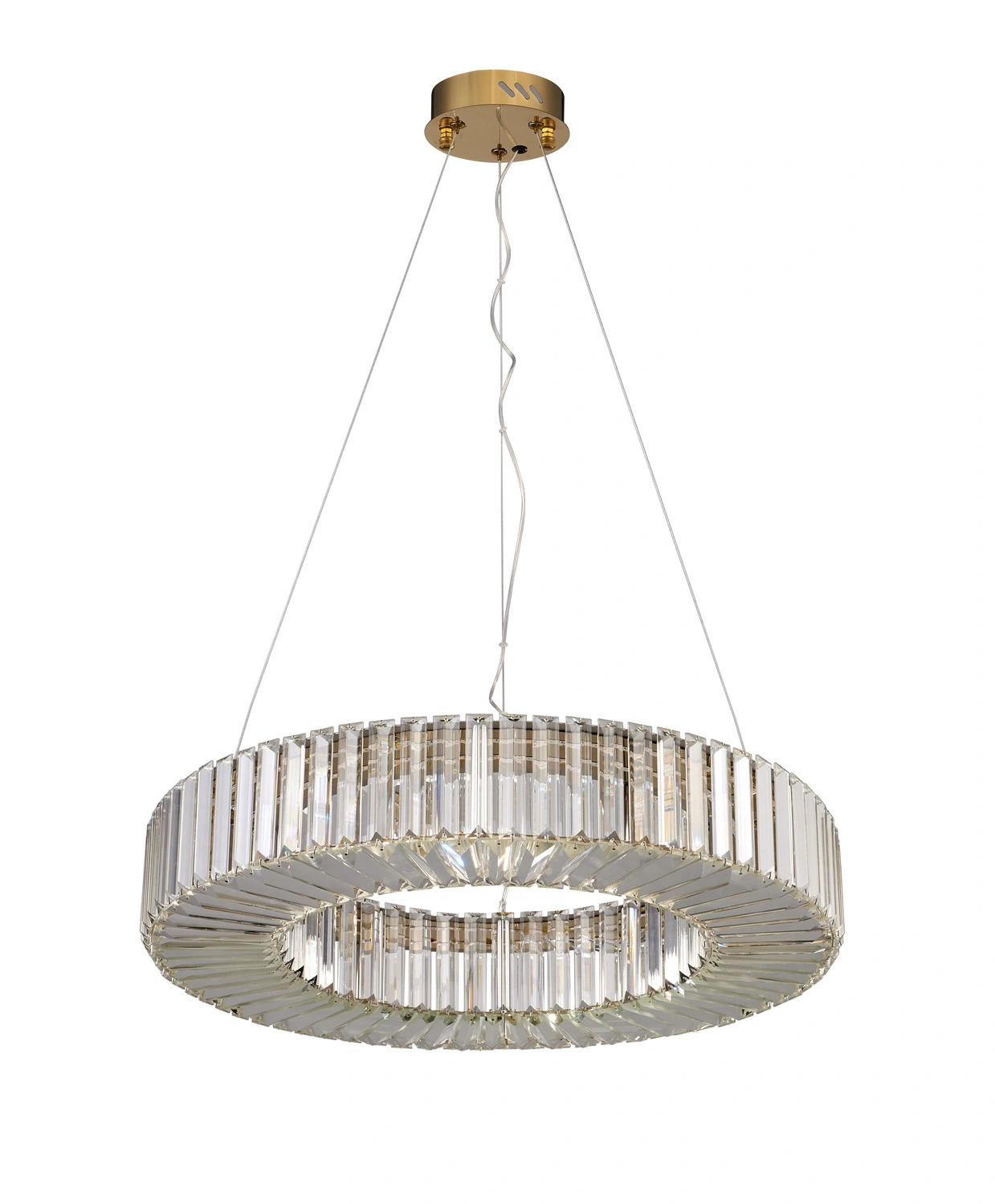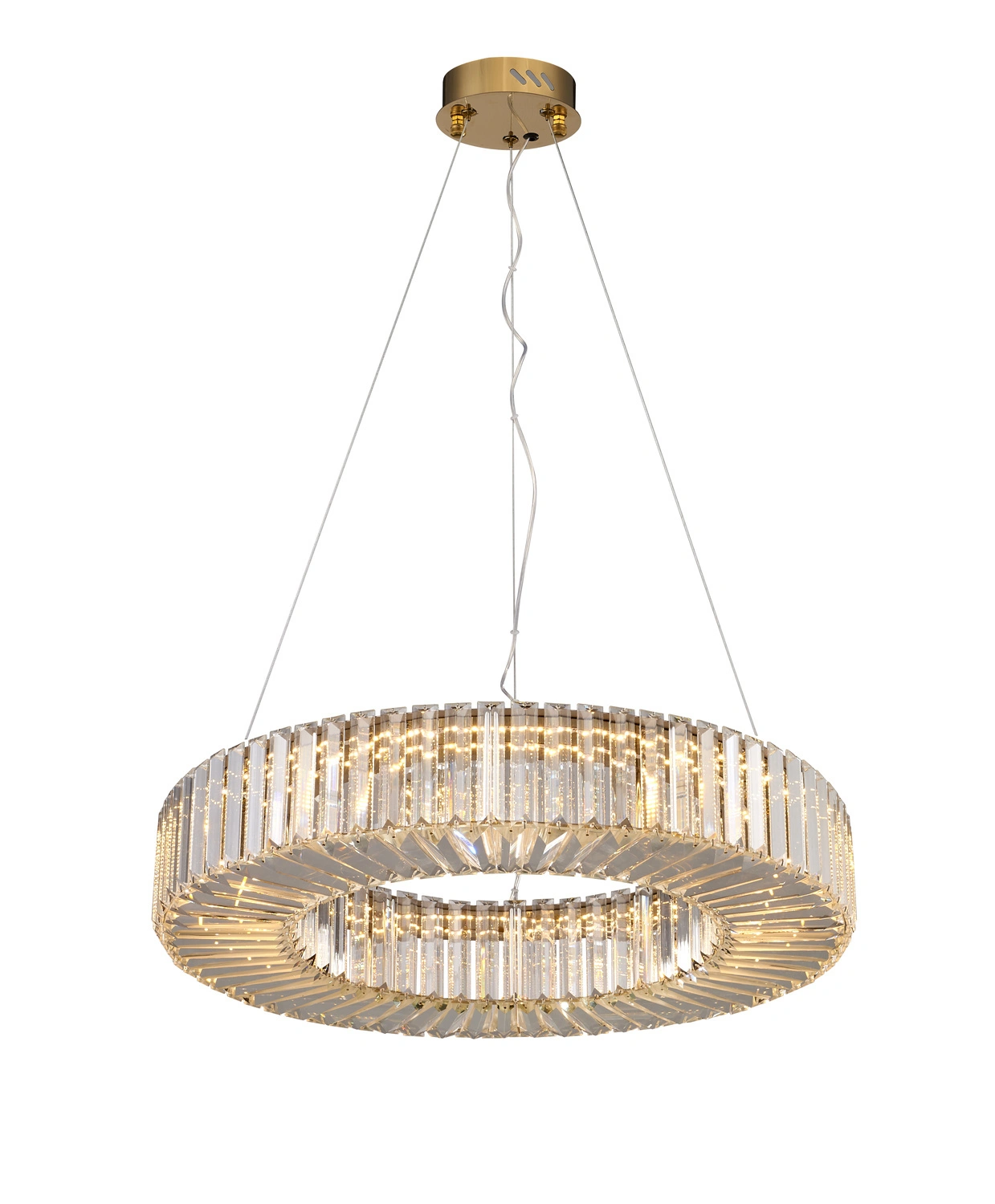 - Luksusowa lampa wisząca z kryształowego szkła i złotym wykończeniem. 60 cm średnicy, LED 60W, 3000K. Elegancja i blask w stylu premium.
