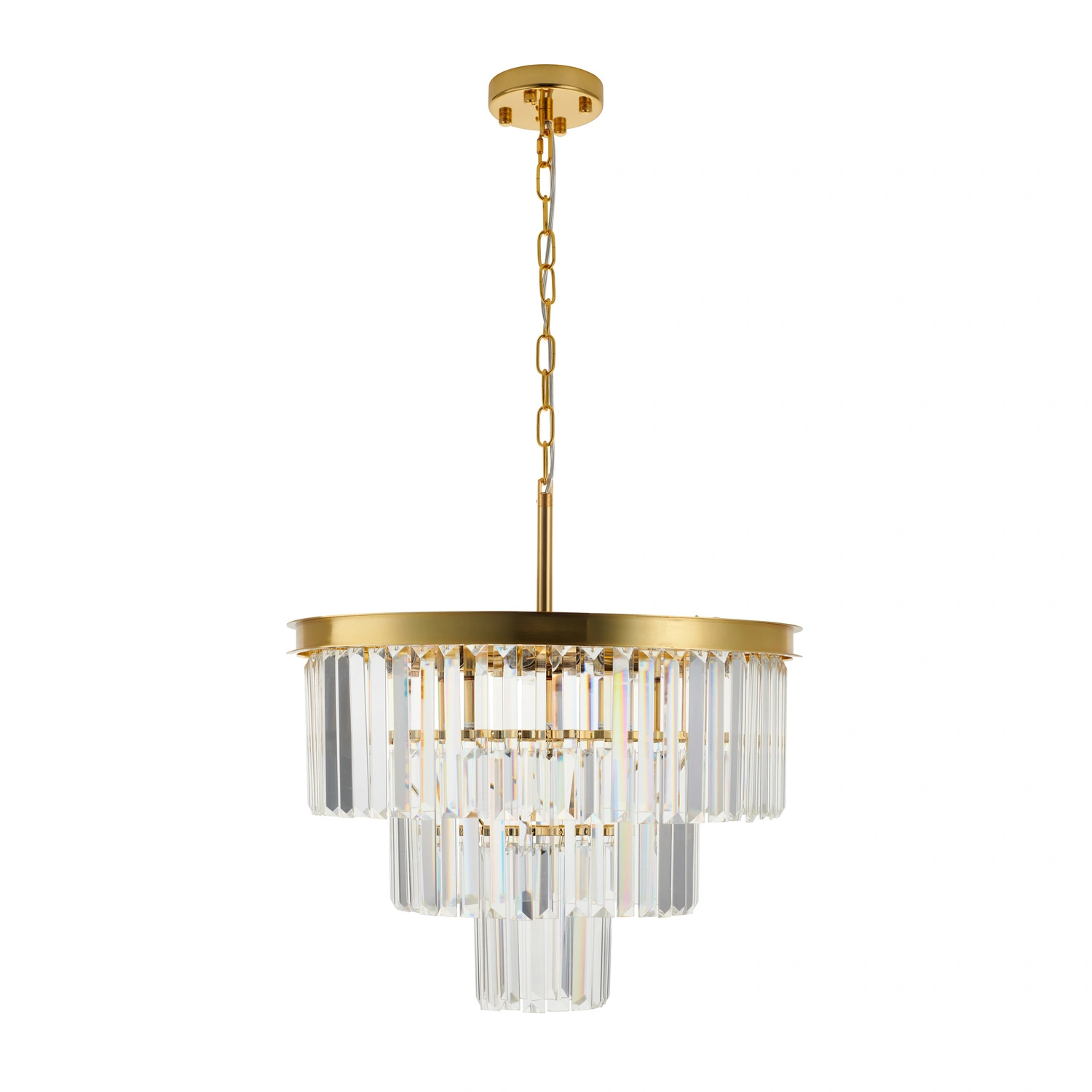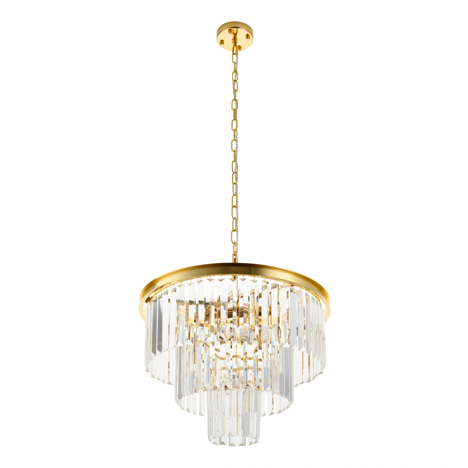 Konstrukcja oparta jest na solidnej, metalowej ramie w wykończeniu złotym, która zapewnia trwałość i stabilność przy dużej średnicy 100 cm. Elementy ze szkła kryształowego gwarantują efekt wielowymiarowego rozproszenia światła, podnosząc standard aranżacji.