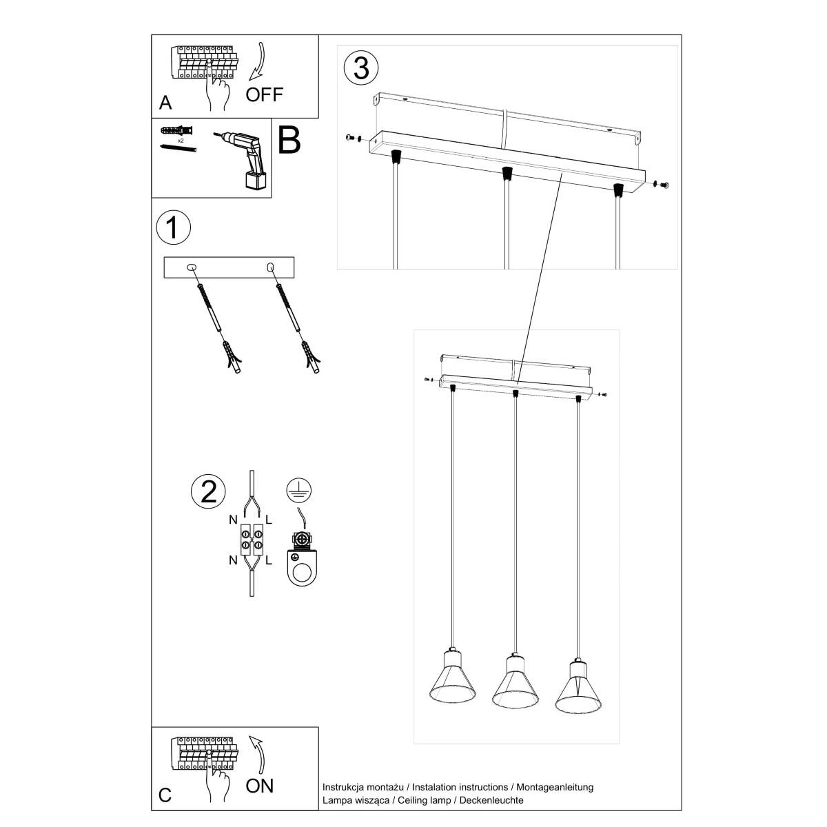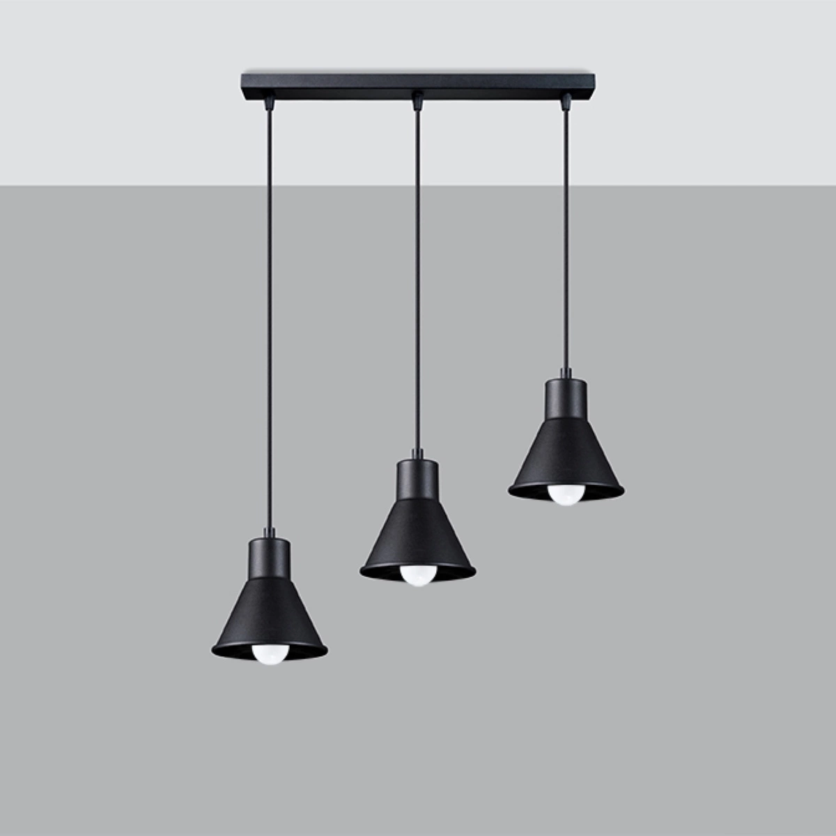 - Źródło światła: E27, 3x max 15W LED, ~230V, 50Hz, IP20, klasa ochronności IŹródło światła nie jest w komplecie. Wymiary: 45/14/120 cmWymiary klosza: 14/14 cmMateriał: stalKolor: czarny