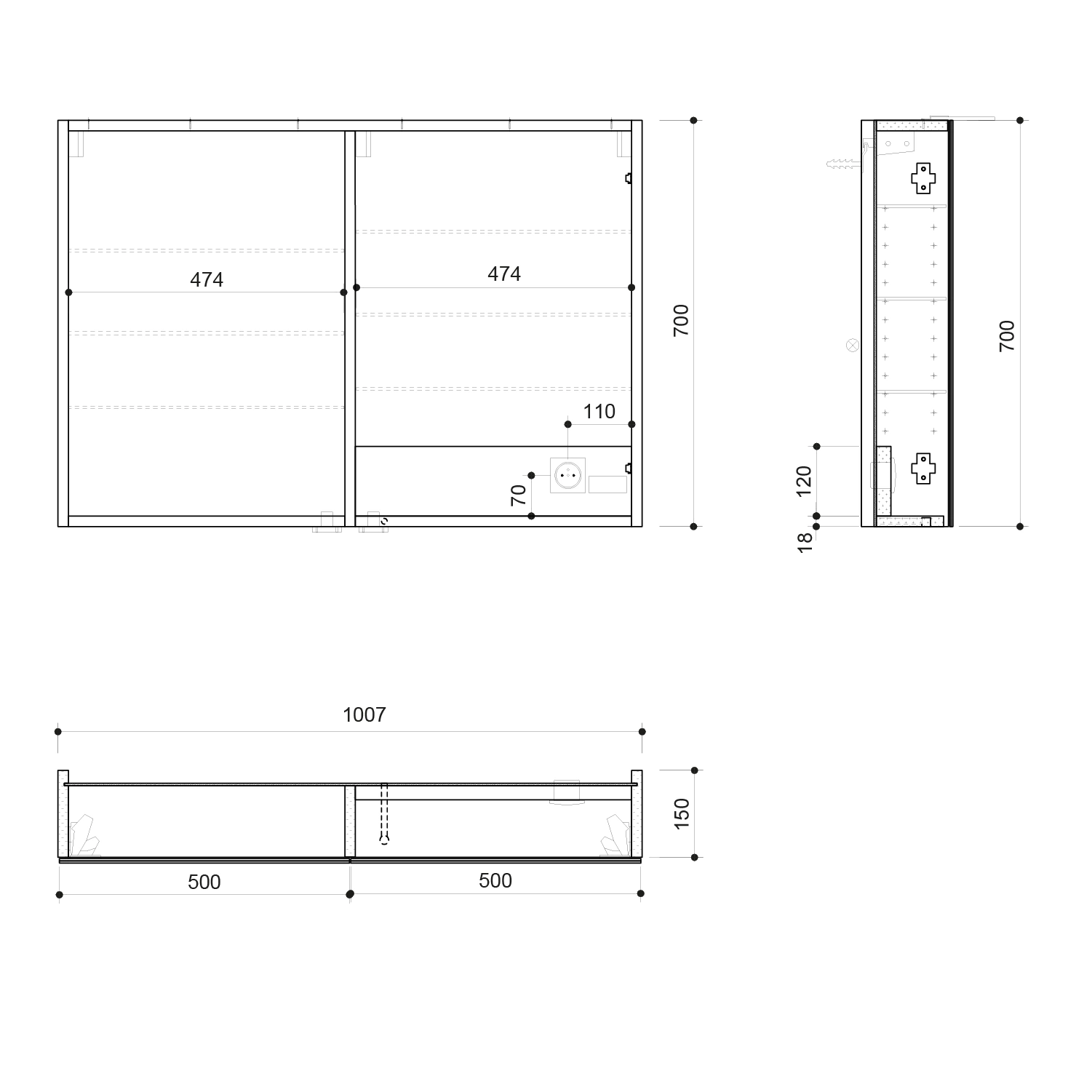 | Wyposażenie | Oświetlenie, Zintegrowane gniazdko elektryczne, Dwustronne drzwiczki lustrzane, Zawiasy samohamujące |