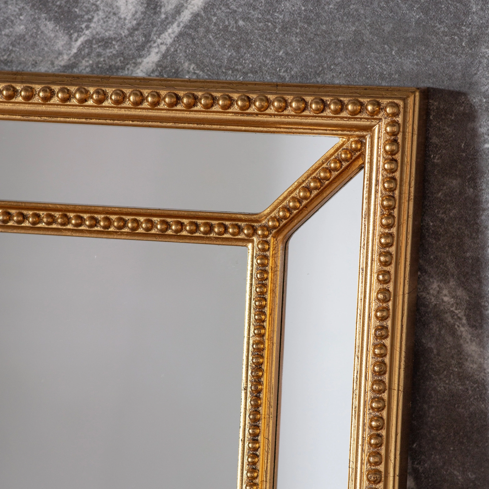 Oszałamiające lustro o klasycznym wyglądzie. Idealne, aby dodać vintage'owego uroku Twojemu domowi. Lustro to, z ramą w kolorze antycznego złota z detalami w postaci koralików, jest dostępne w dwóch kształtach, aby pasowało do każdej przestrzeni.