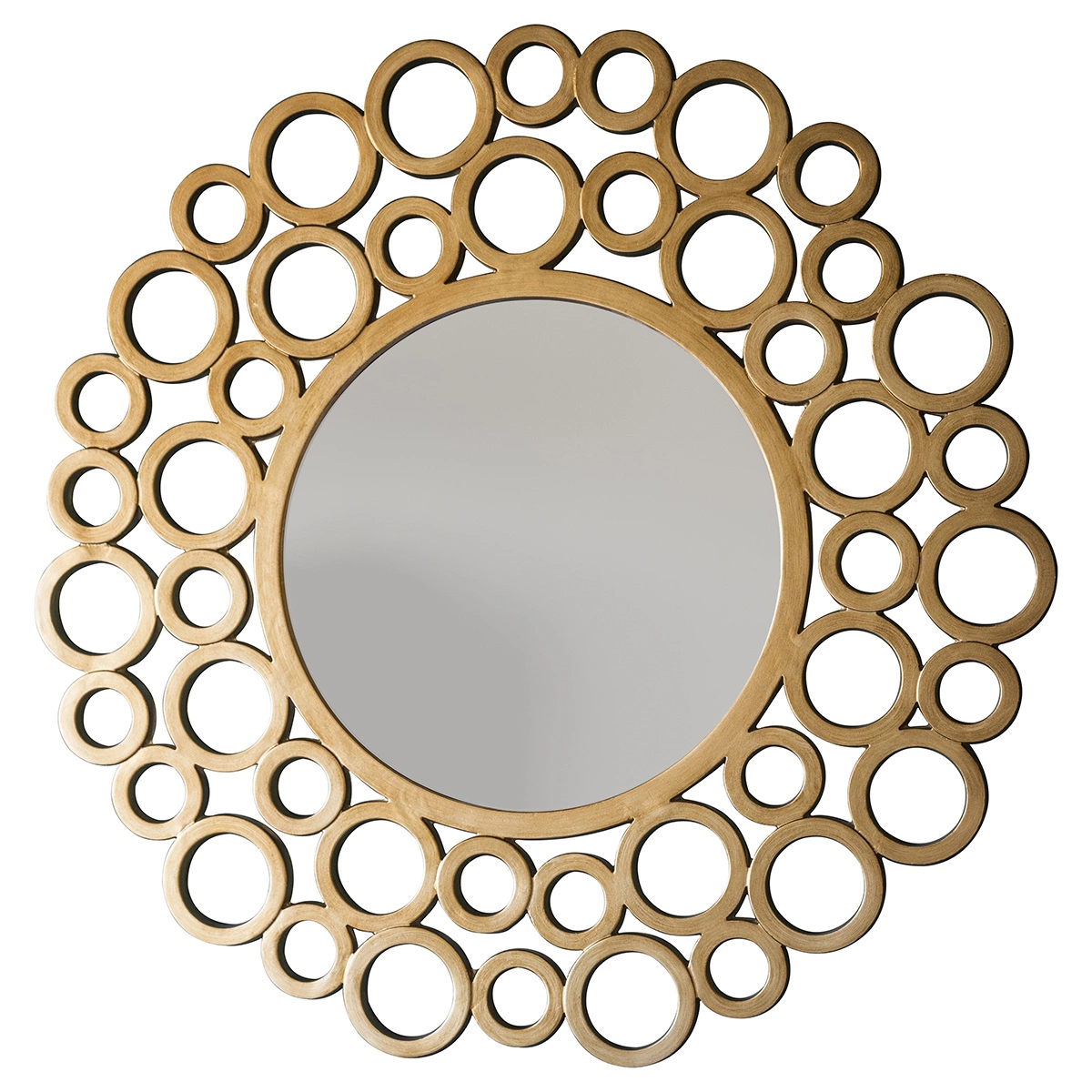 Dynamiczne lustro z płaskim pierścieniem w ciepłym złocistym wykończeniu.