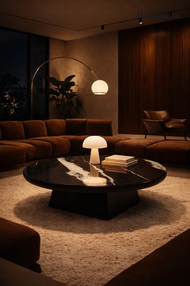 Okrągły blat z żywicy zachwyca subtelnym, marmurowym wzorem, który nadaje powierzchni głębi i elegancji.