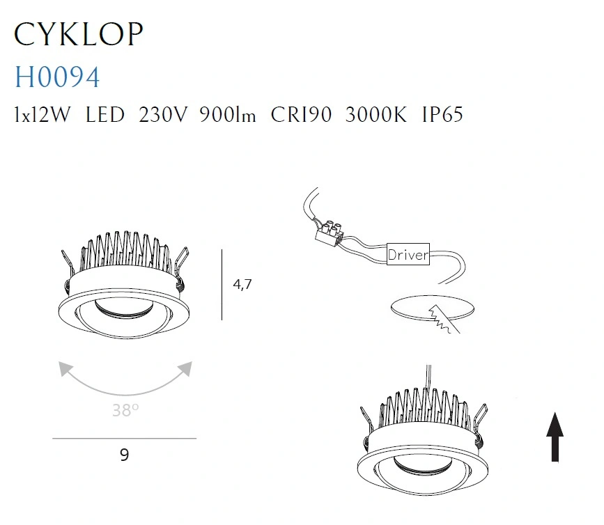 H: 4,7 cm, Ø: 9,0 cm, Kąt świecenia/beam angle: 38°