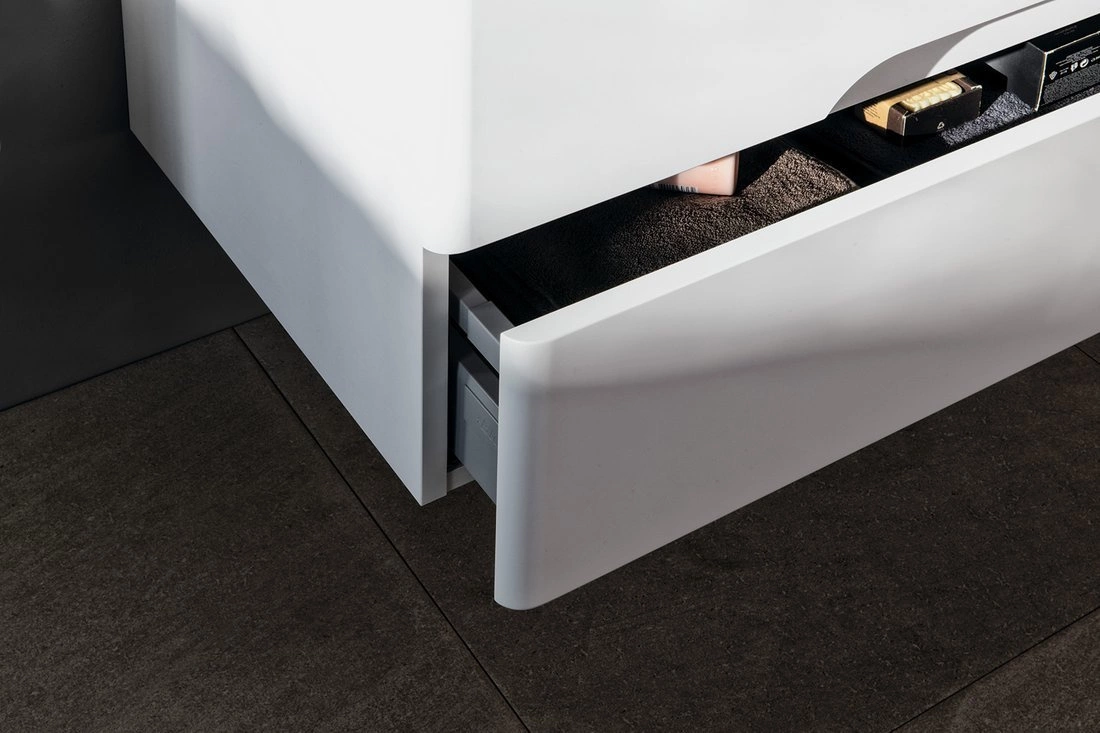 Podstawową cechą serii MEDIENA to połączenie korpusu w kolorze biały mat z szufladami z litego drewna o ciekawym kształcie otworu na frontach. Zaokrąglony kształt frontów doskonale nawiązuje do kształtu ceramicznych umywalek SAND. Do niektórych szafek z serii pasują również umywalki NORM.