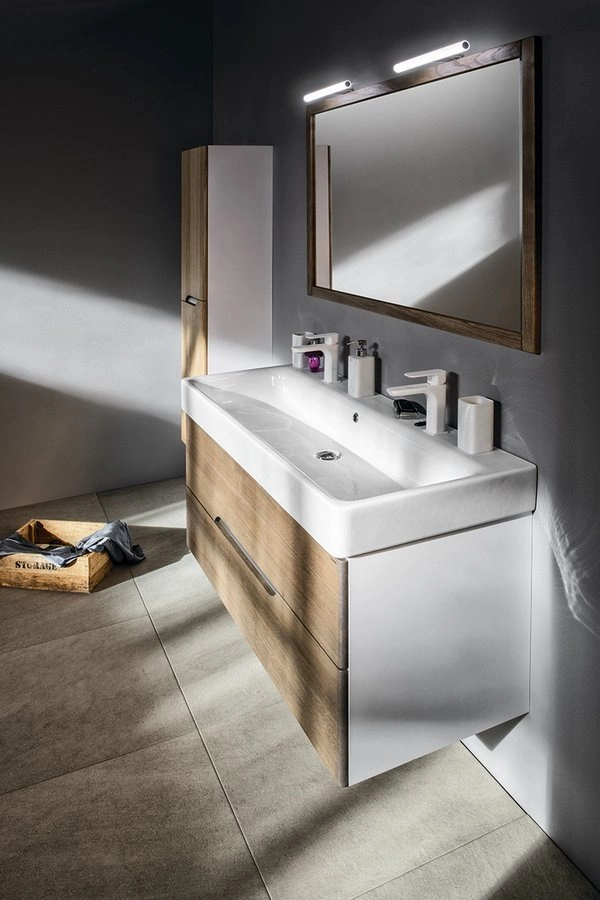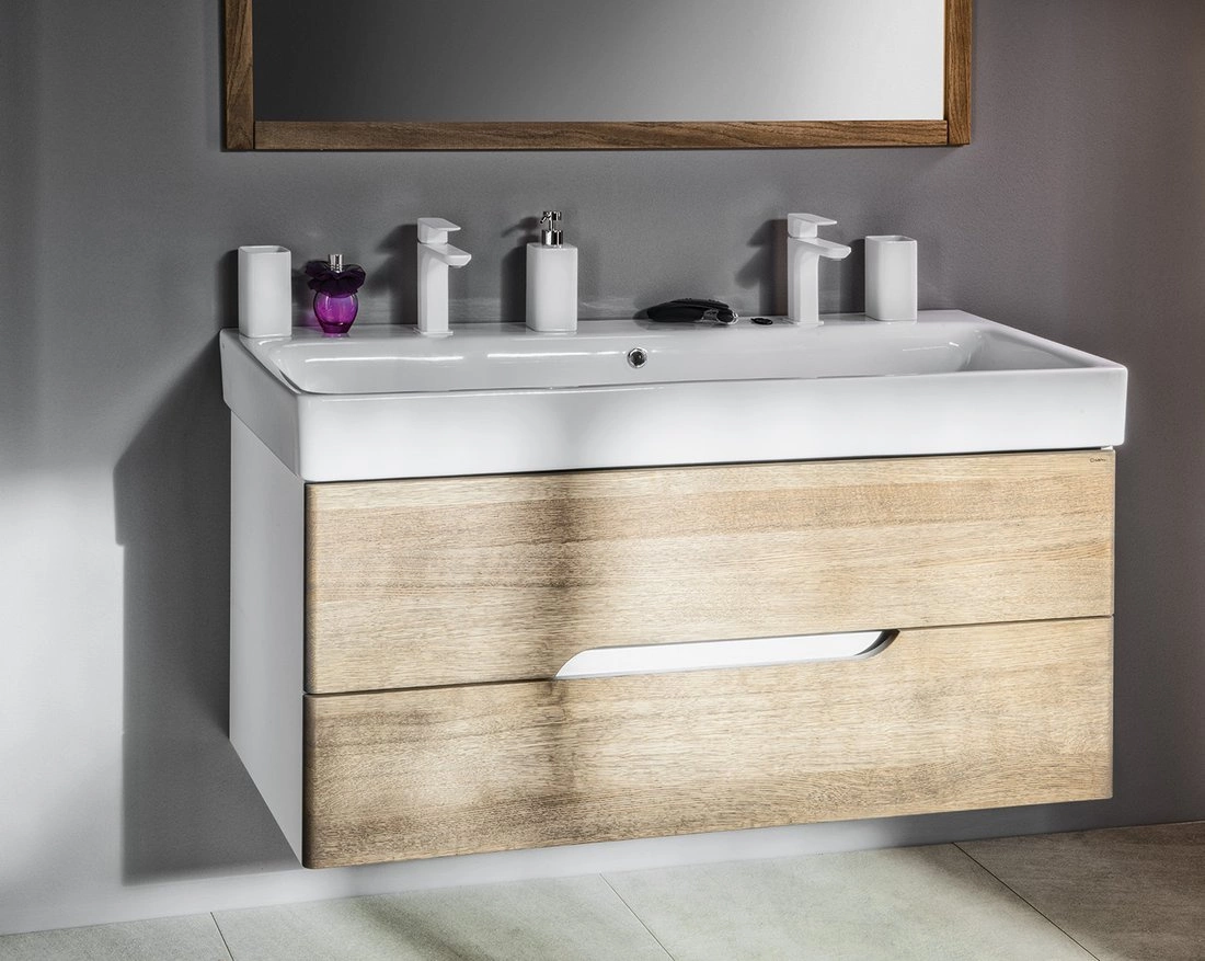 Podstawową cechą serii MEDIENA to połączenie korpusu w kolorze biały mat z szufladami z litego drewna o ciekawym kształcie otworu na frontach. Zaokrąglony kształt frontów doskonale nawiązuje do kształtu ceramicznych umywalek SAND. Do niektórych szafek z serii pasują również umywalki NORM.