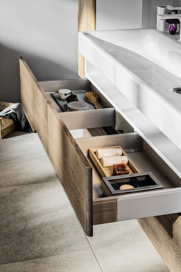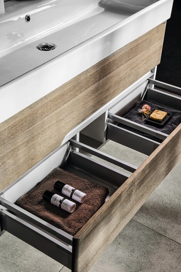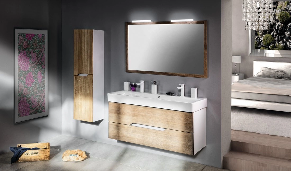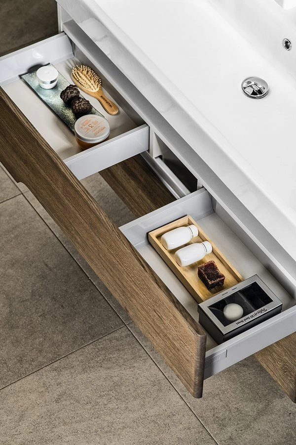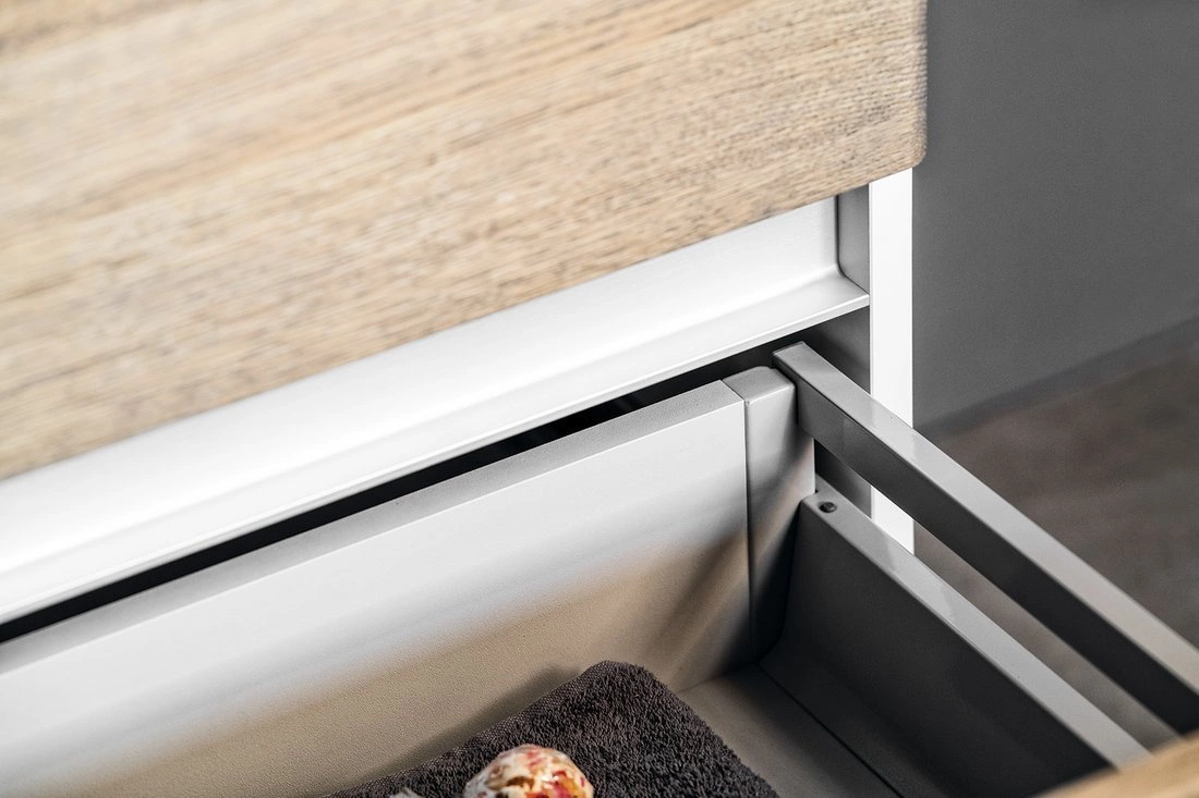 W ofercie szafki z frontami w kolorze biały mat lub 2 dekorach litego drewna dębowego (olej woskowy dąb natural albo dąb graphite), szafki pod umywalkę w szerokościach 60, 80,100 i 120 cm. Szuflady wyposażone są w prowadnice BLUM z fukcją cichego domyku BUMOTION z dożywotnią gwarancją, szuflady o szerokościach 80 i 100 można dodatkowo wyposażyć praktycznym organizerem.Cały zestaw można uzupełnić słupkiem MEDIENA, który jest dostępny w dwu wymiarach. Słupek o szerokości 35 cm można dodatkowo wyposażyć tkaninowym koszem na bieliznę.