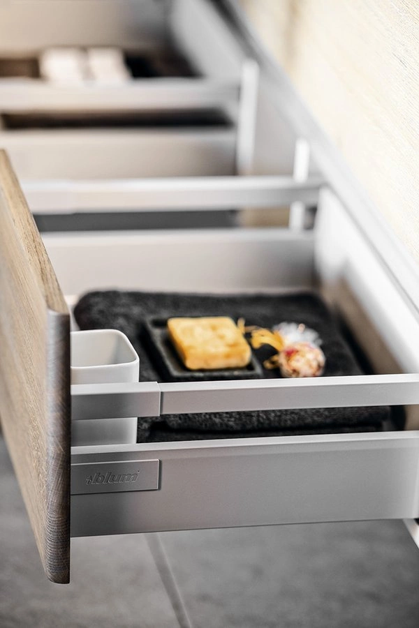 Szuflady naszych mebli wyposażone są w prowadnice z systemem powolnego i cichego domyku. Wystarczy jedno pchnięcie i szuflada domknie się sama, cicho i delikatnie.