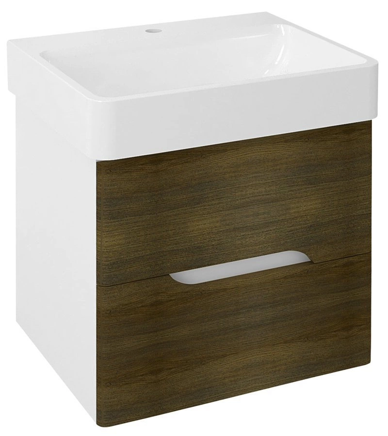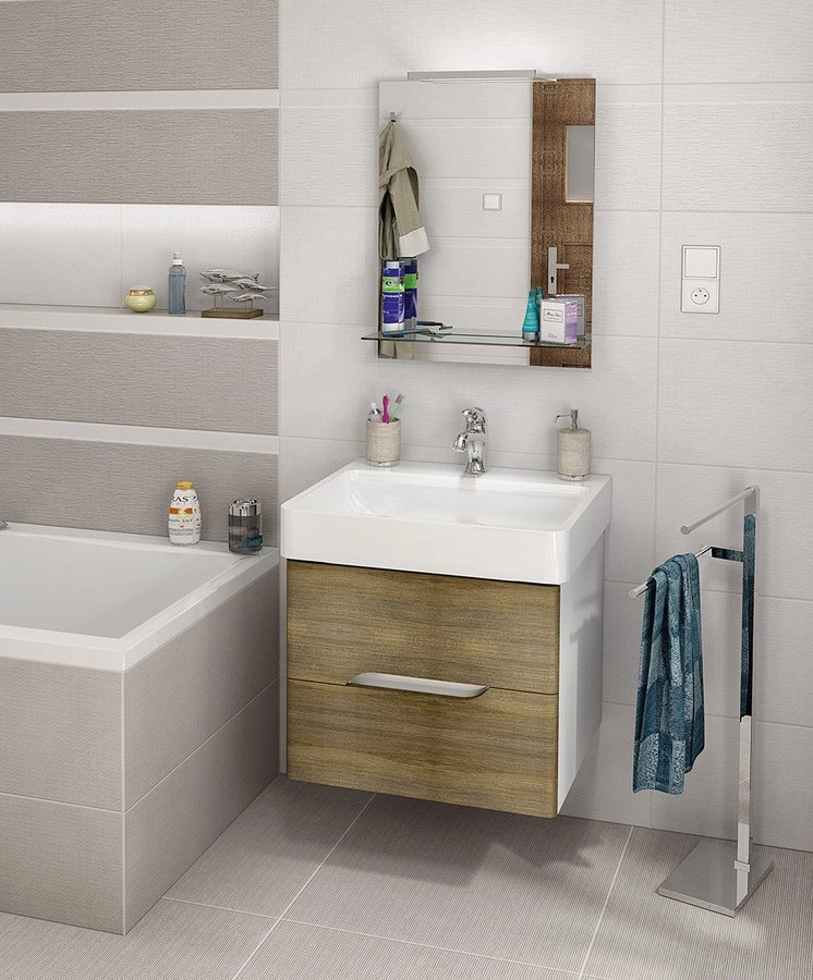 Podstawową cechą serii MEDIENA to połączenie korpusu w kolorze biały mat z szufladami z litego drewna o ciekawym kształcie otworu na frontach. Zaokrąglony kształt frontów doskonale nawiązuje do kształtu ceramicznych umywalek SAND. Do niektórych szafek z serii pasują również umywalki NORM.