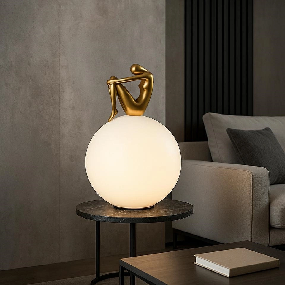 Duży okrągły biały klosz wykonano z polipropylenu, a wyjątkowość lampy podkreśla piękna kobieca postać wykonana z żywicy, która siedzi na kloszu.