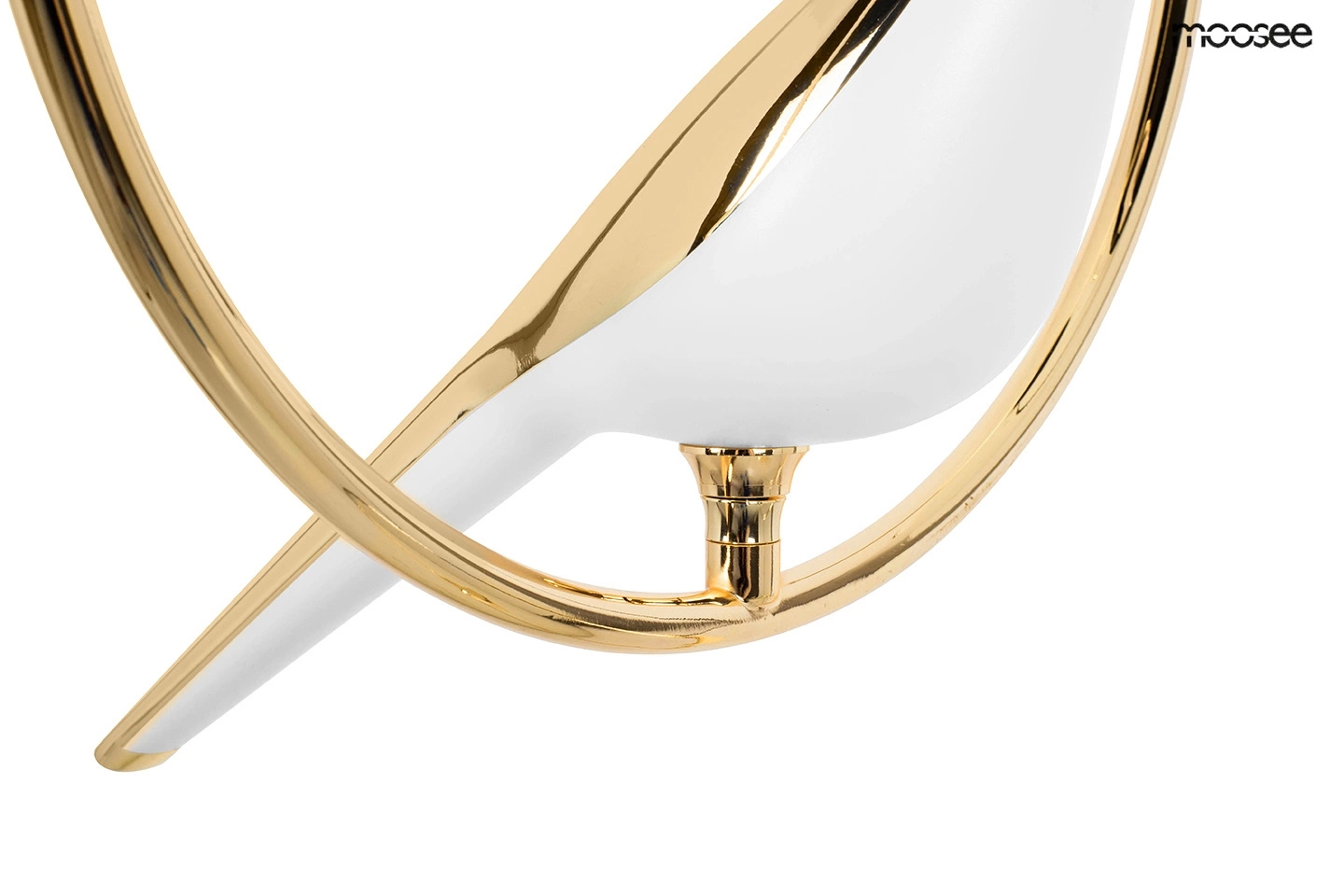 MOOSEE lampa wisząca BIRD złota. Designerski motyw lampy wykonany z połączenia akrylu i metalu w nowoczesnej kolorystyce. Biało-złoty ptaszek zawieszony na złotym okręgu został zamocowany czarnym przewodem do podłużnej, metalowej podsufitki w kolorze czarnym. Kolekcja Bird pozwala na stworzenie spójnych aranżacji, które pięknym akcentem udekorują każdą przestrzeń. Światło: LED 9 W / 720 lm / 3000 K Oprawa: wys. 324 cm / szer. 34,5 cm / gł. 12 cm Ptak: wys. 30 cm / szer. 9,5 / gł. 30 cm Okręg: śr. 35 cm Mocowanie: wys. 4 cm / szer.20 cm / gł. 5 Kabel: 290 cm Montaż: instalacja sufitowa Waga brutto: 1,1 kg Wymiary opakowania: 41 cm / 41 cm / 16 cm.
