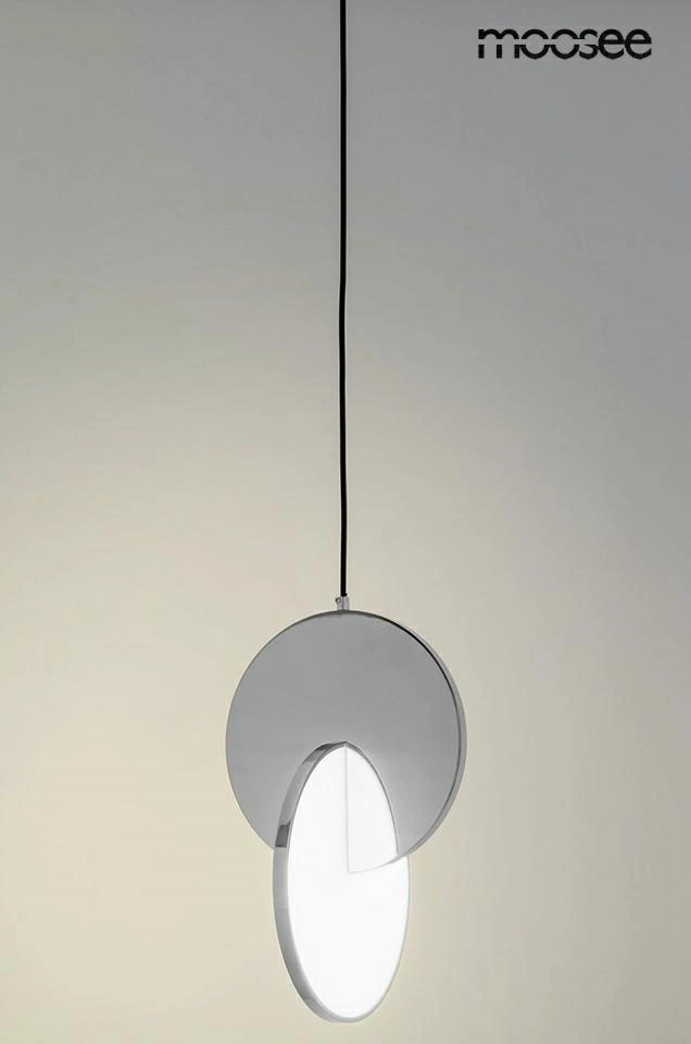 MOOSEE lampa wisząca DISCO srebrna. Oprawa w kolorze chromowanym została wykonana ze stali polerowanej. Niespotykane połączenie dwóch dysków, które tworzą wyjątkową całość. Wbudowany moduł LED o ciepłej barwie światła zapewni optymalne oświetlenie. Lampa będzie doskonałym dodatkiem do wnętrz mieszkalnych lub restauracyjno-hotelowych. Światło: LED 14 W / 1120 lm / 3000 K Oprawa: wys. 240 cm / szer. 25 cm / gł. 25 cm Klosz: wys. 38 cm / szer. 25 cm/ gł. 1,4 cm Mocowanie: wys. 2,5 cm / śr. 12 cm Przewód: 200 cm Montaż: instalacja sufitowa Waga netto: 2 kg Wymiary opakowania: 30,5 cm / 45 cm / 31 cm.