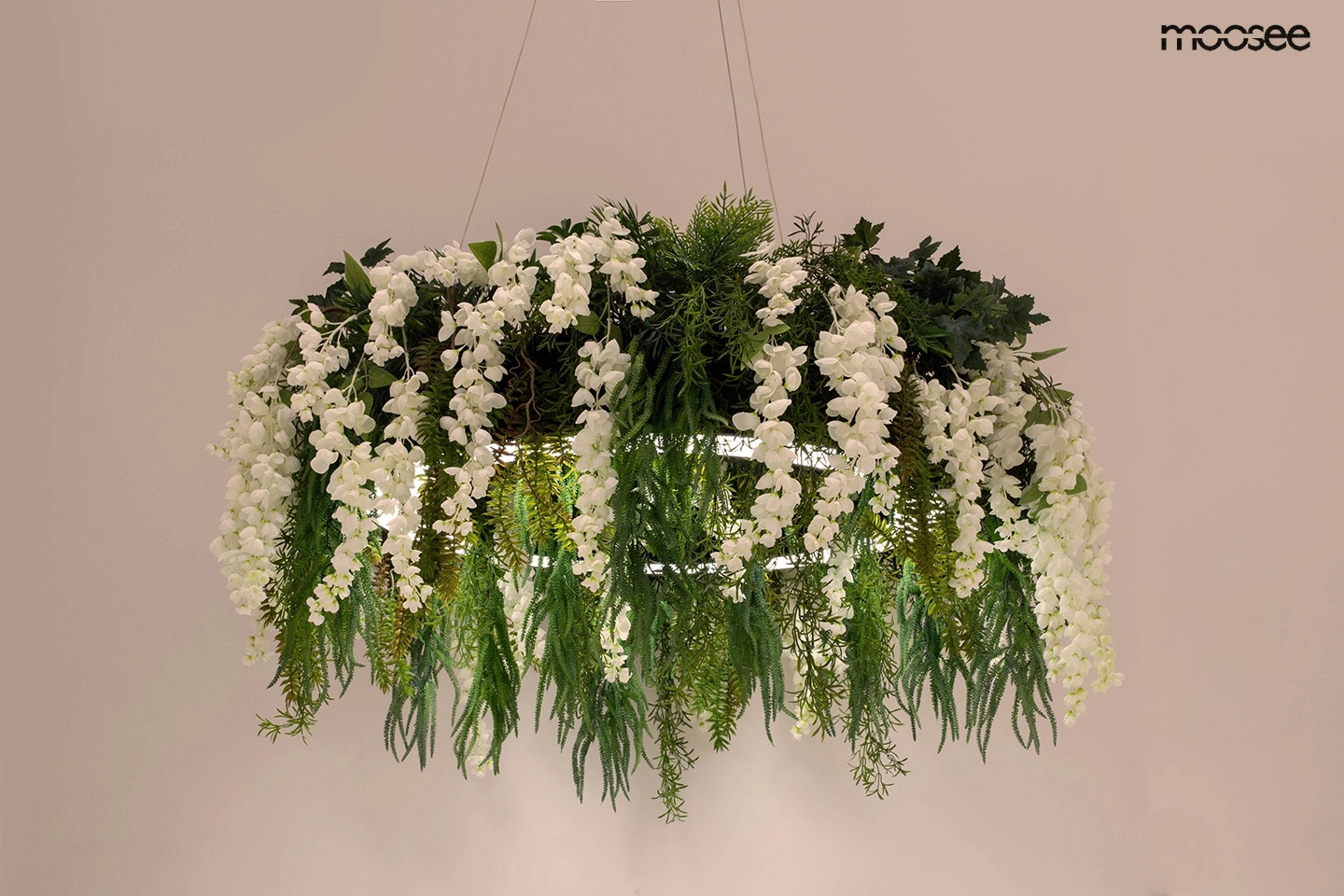 MOOSEE lampa wisząca GARDENS WISTERIA 90. Kolekcja Gardens to wyjątkowy element dekoracyjny, który łączy w sobie funkcjonalność oświetlenia z estetyką inspirowaną naturą. Wyjątkowy design nawiązuje do bujnej roślinności, a sztuczne kwiaty rozmieszczone są na eleganckim, czarnym ringu. Dzięki dołączonemu pilotowi, istnieje możliwość zmiany barwy światła na 3 odcienie. Wbudowany ściemniacz pozwala na dostosowanie atmosfery wnętrza do własnych upodobań. Lampa jest dostępna w różnych rozmiarach oraz w klasycznej zielonej wersji. To idealne rozwiązanie dla osób, które chcą wprowadzić do swojego wnętrza odrobinę natury w nowoczesnym wydaniu. Czas realizacji wynosi do 14 dni roboczych. Światło: LED 155 W / 12400 lm / 3 barwy światła Oprawa: wys. 210 cm / szer. 100 cm / gł. 100 cm Klosz z roślinami: wys. 80 cm / śr. 100 cm Klosz bez roślin: wys. 14,5 cm / śr. 90 cm Podsufitka: wys. 4 cm / śr. 25 cm Przewód: 195 cm.