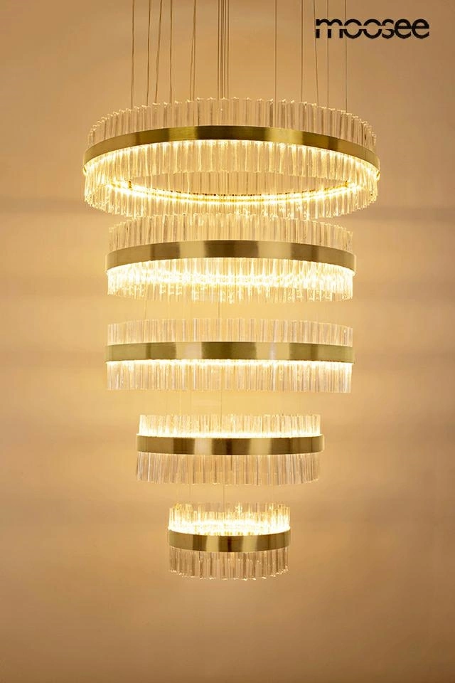 Spektakularny efekt tworzy 5 stalowych ringów wykończonych w szykownym złotym kolorze, które wzbogacono szklanymi, przezroczystymi kloszami.