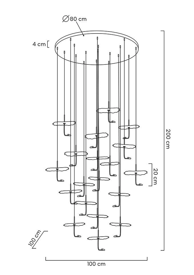 Poprzez zawieszenie kloszy kaskadowo otrzymujemy spektakularny efekt przypominający taniec liści na wietrze.