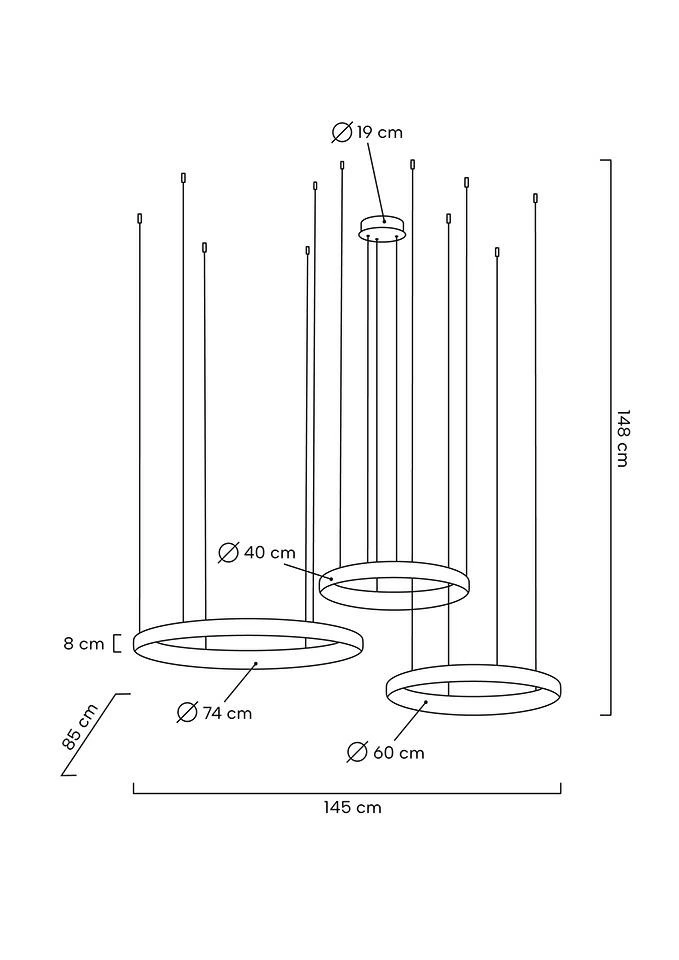 Trzy okręgi o różnych rozmiarach zawieszono na cienkich linkach z możliwością regulacji wysokości,